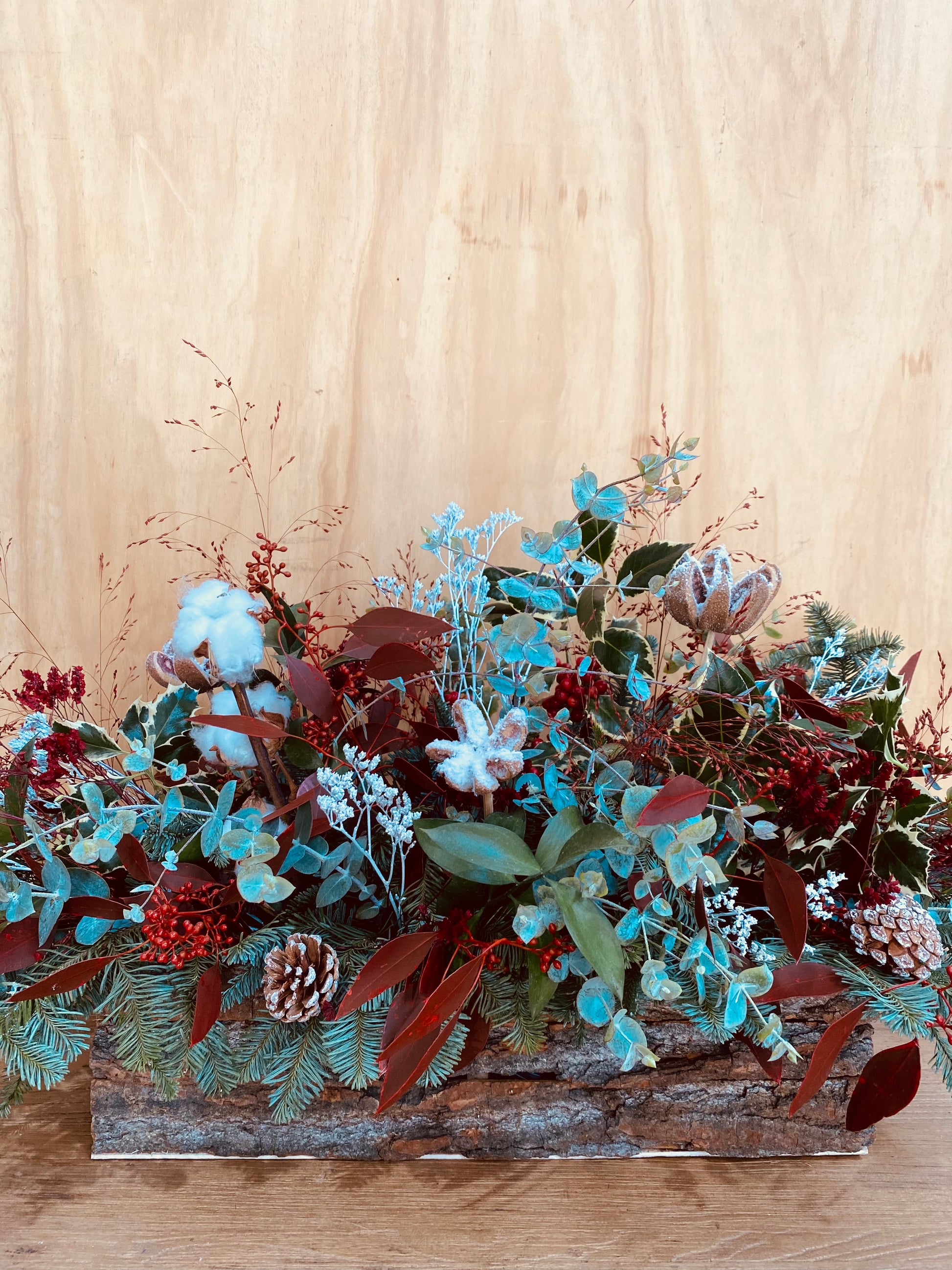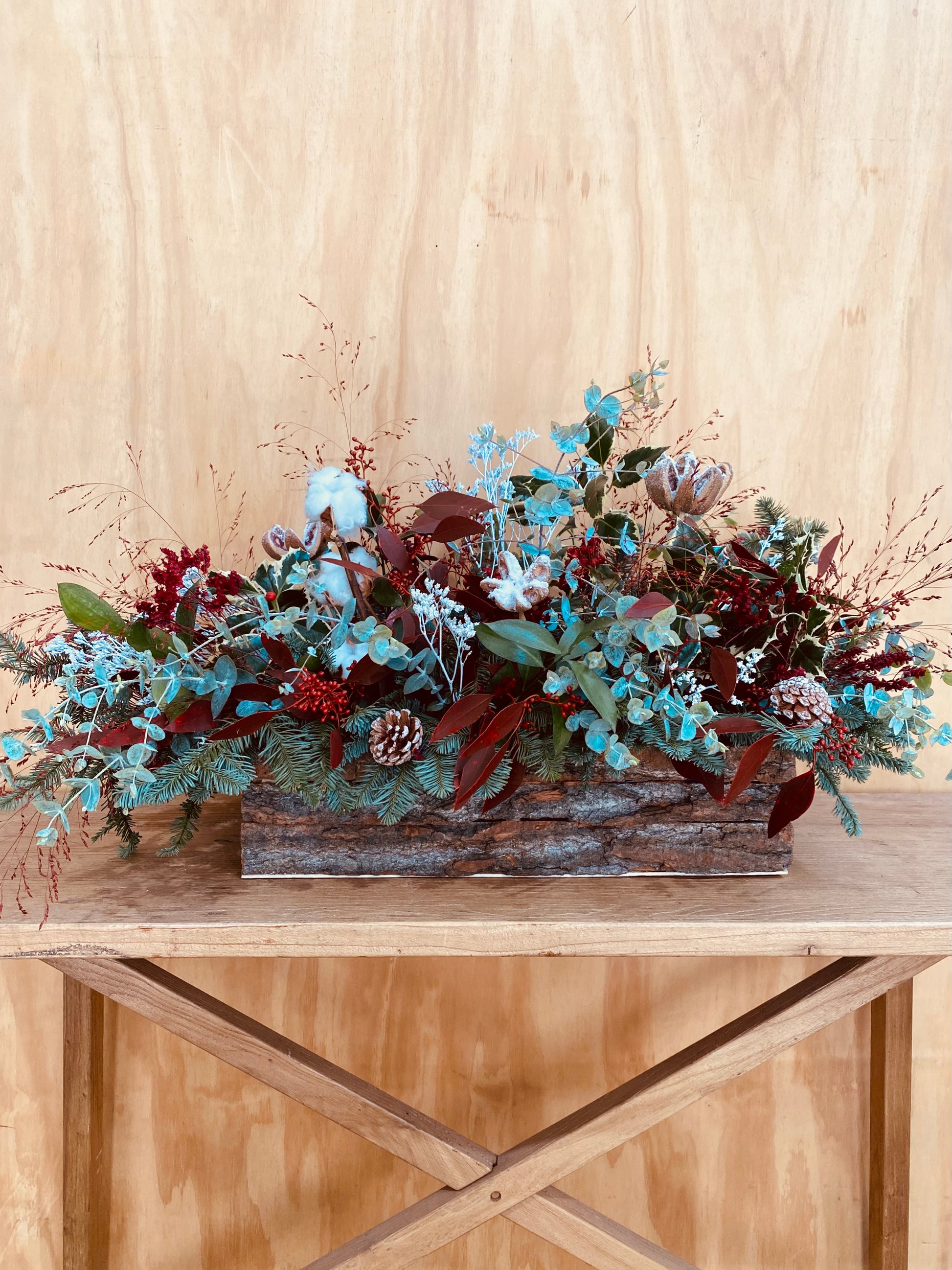 Centro de mesa formado por caja rectangular de tronco de madera natural de dimensiones 40x15x15cm. Combina elementos naturales, preservados y tintados para garantizar la durabilidad y lo disfrutes durante toda la Navidad.