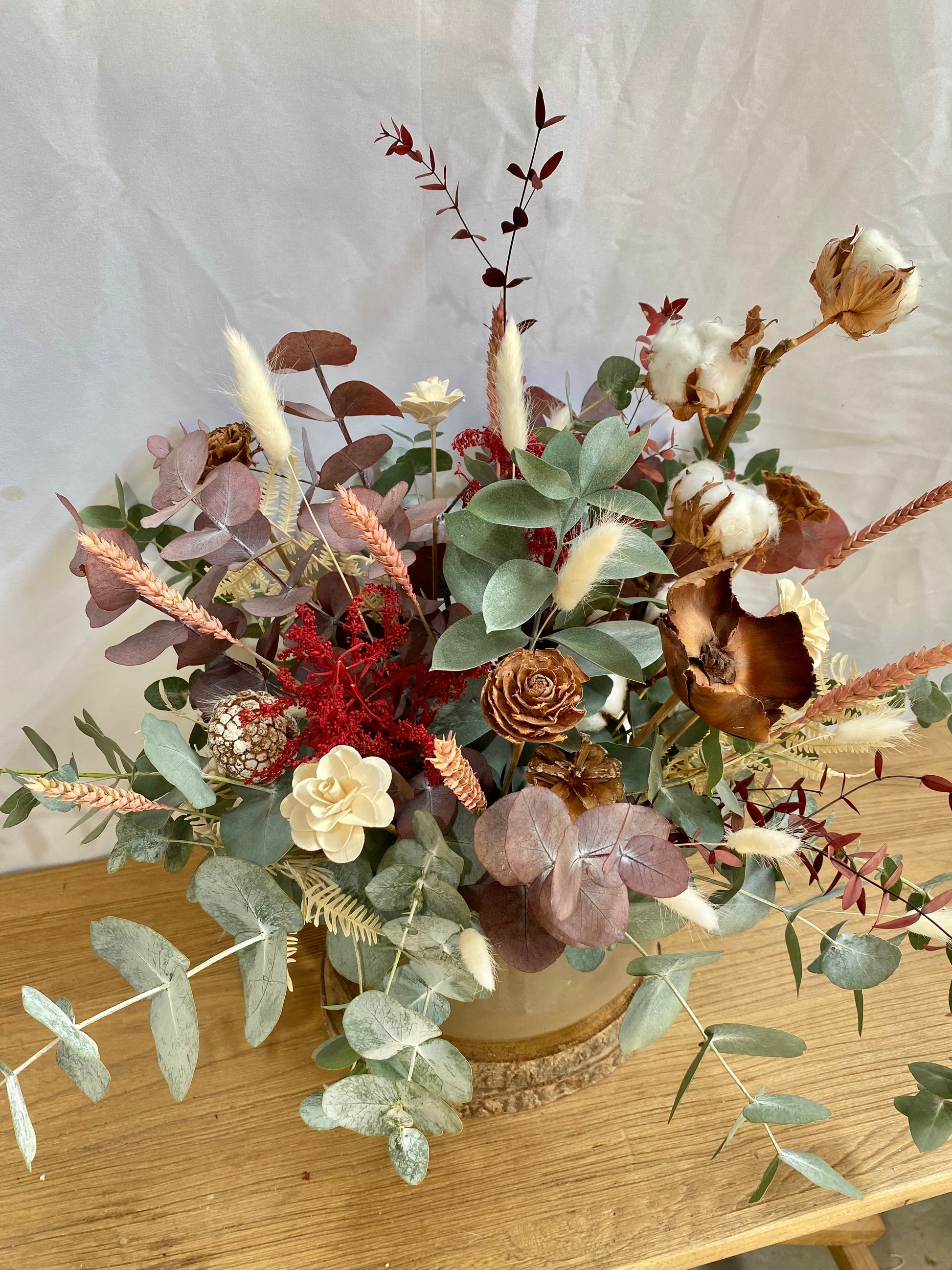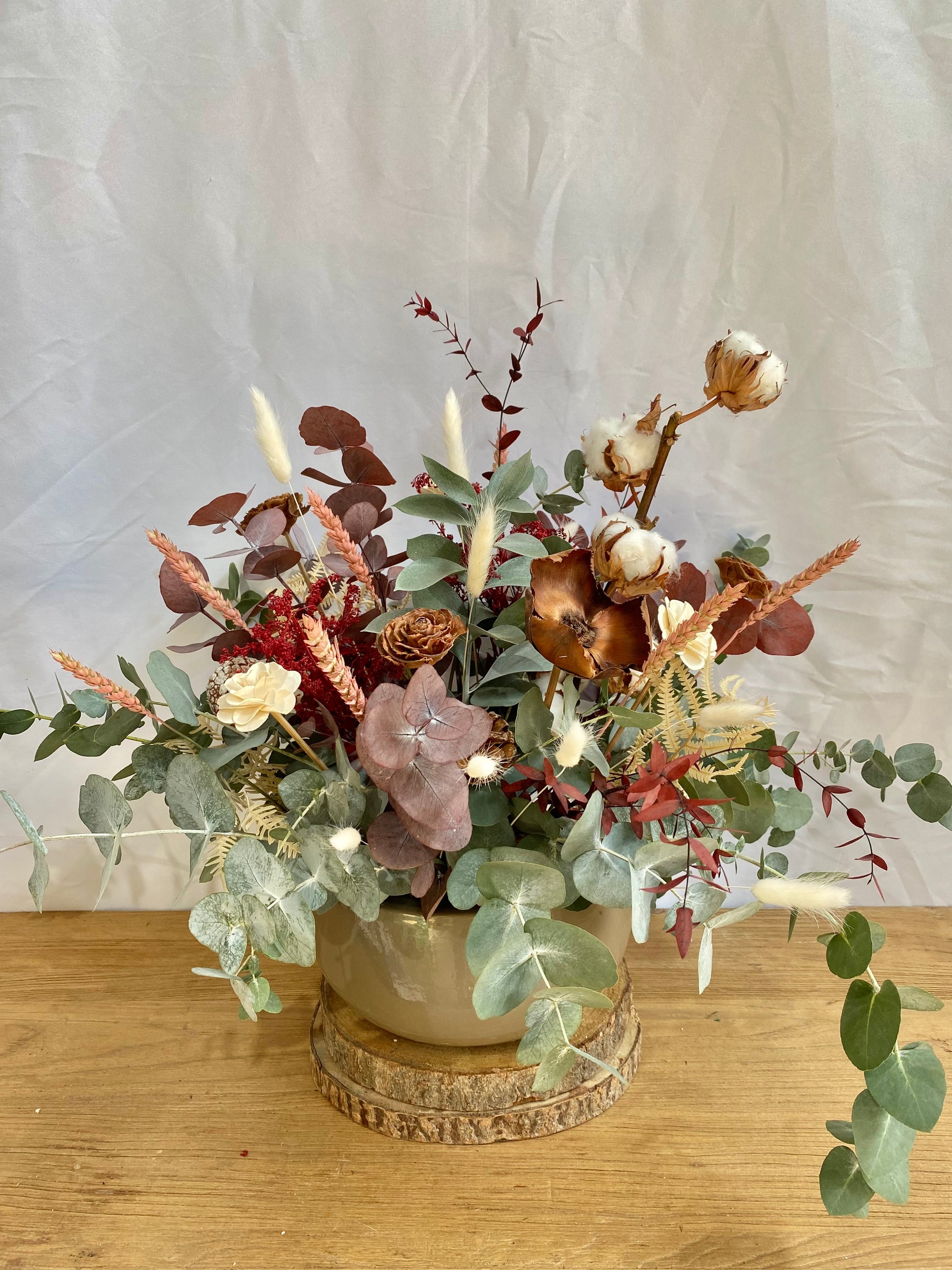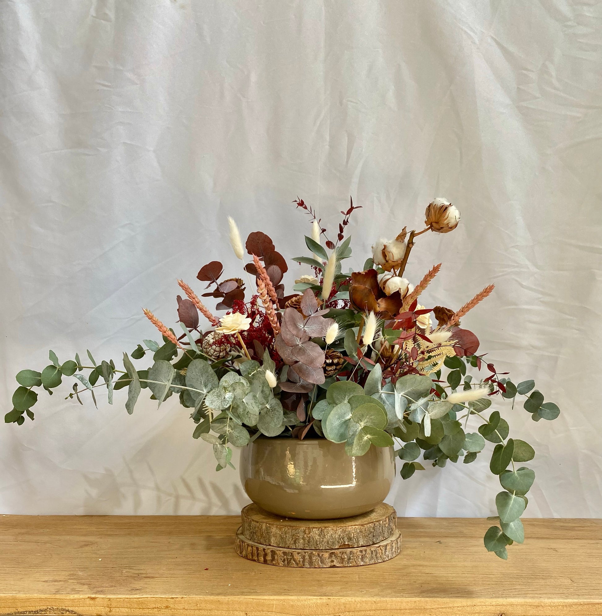 Centro con base cerámica brillo color topo. Ideal para dar un toque otoñal a tu mesa o rincón decorado