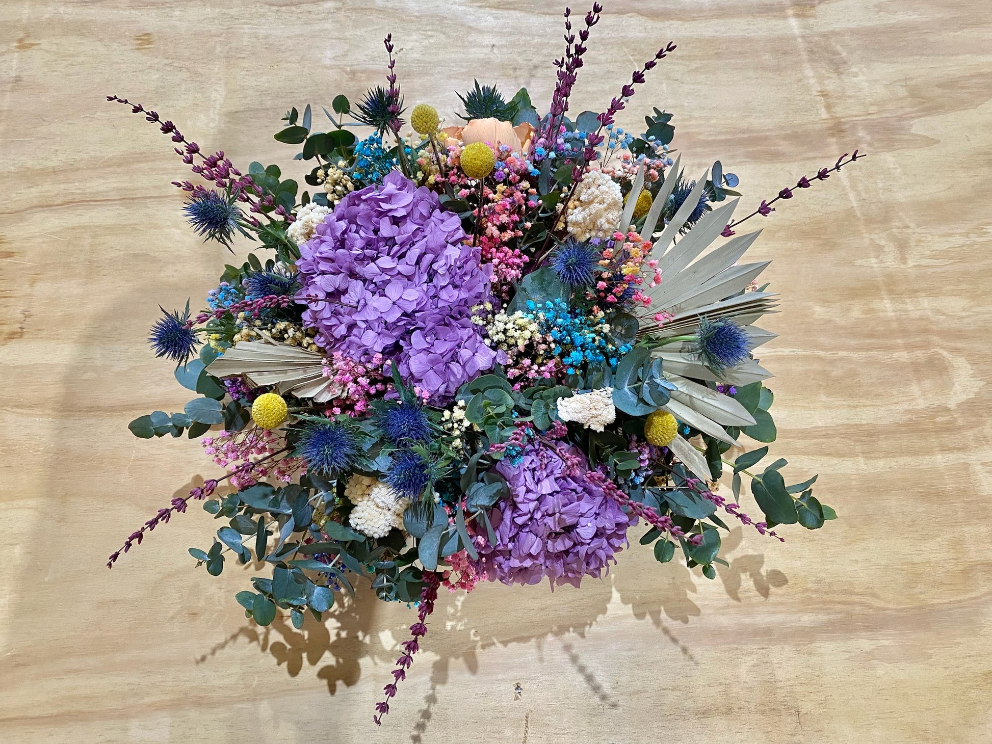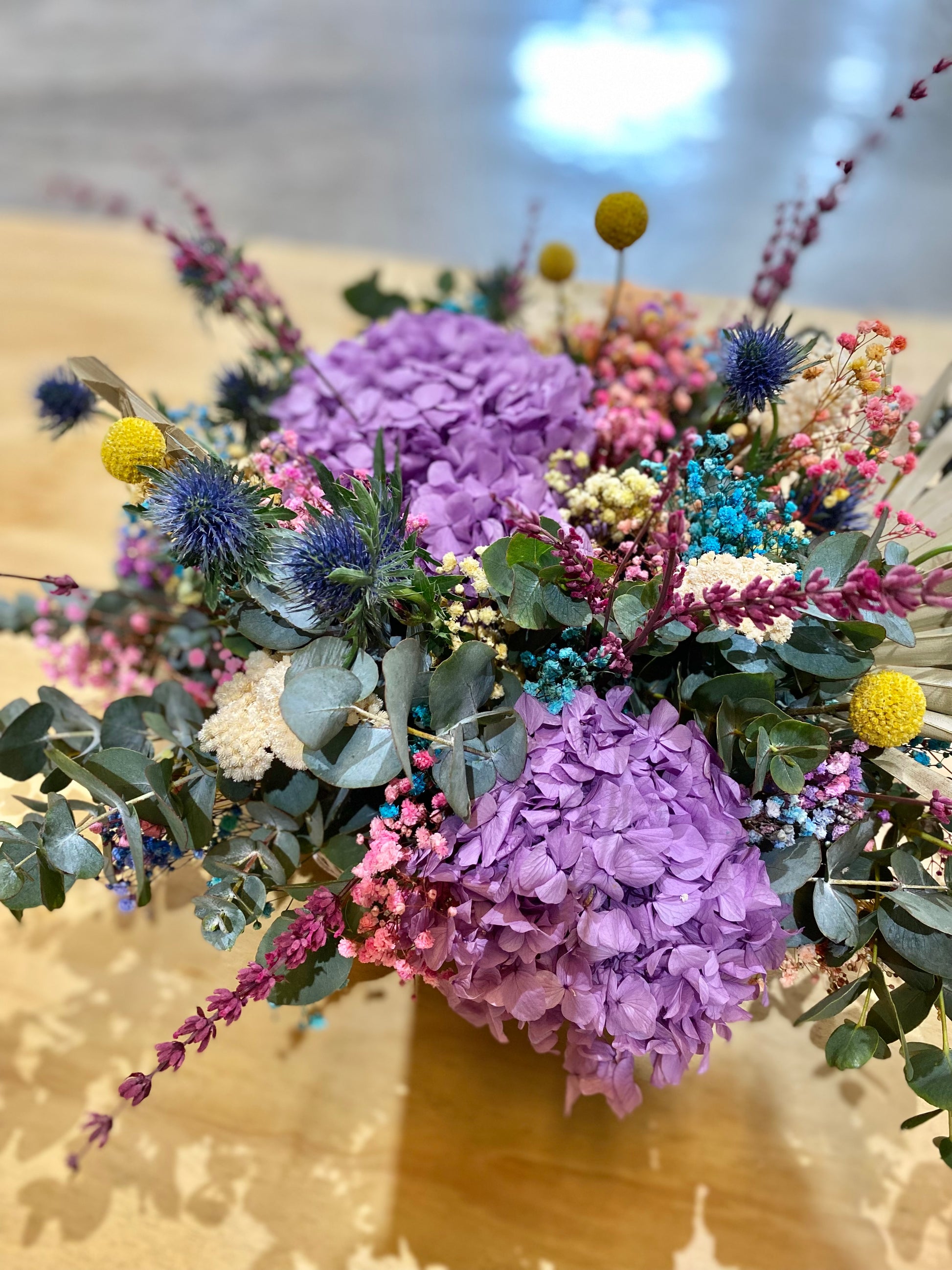 Cesta redonda de mimbre natural en color blanco roto de 20 cm de diámetro compuesta por eucalipto cinérea, hortensia preservada malva, paniculata de colores, craspedia, eryngium azul, lavanda rosa, achilea blanca, hoja de palma y palm cup melocotón.