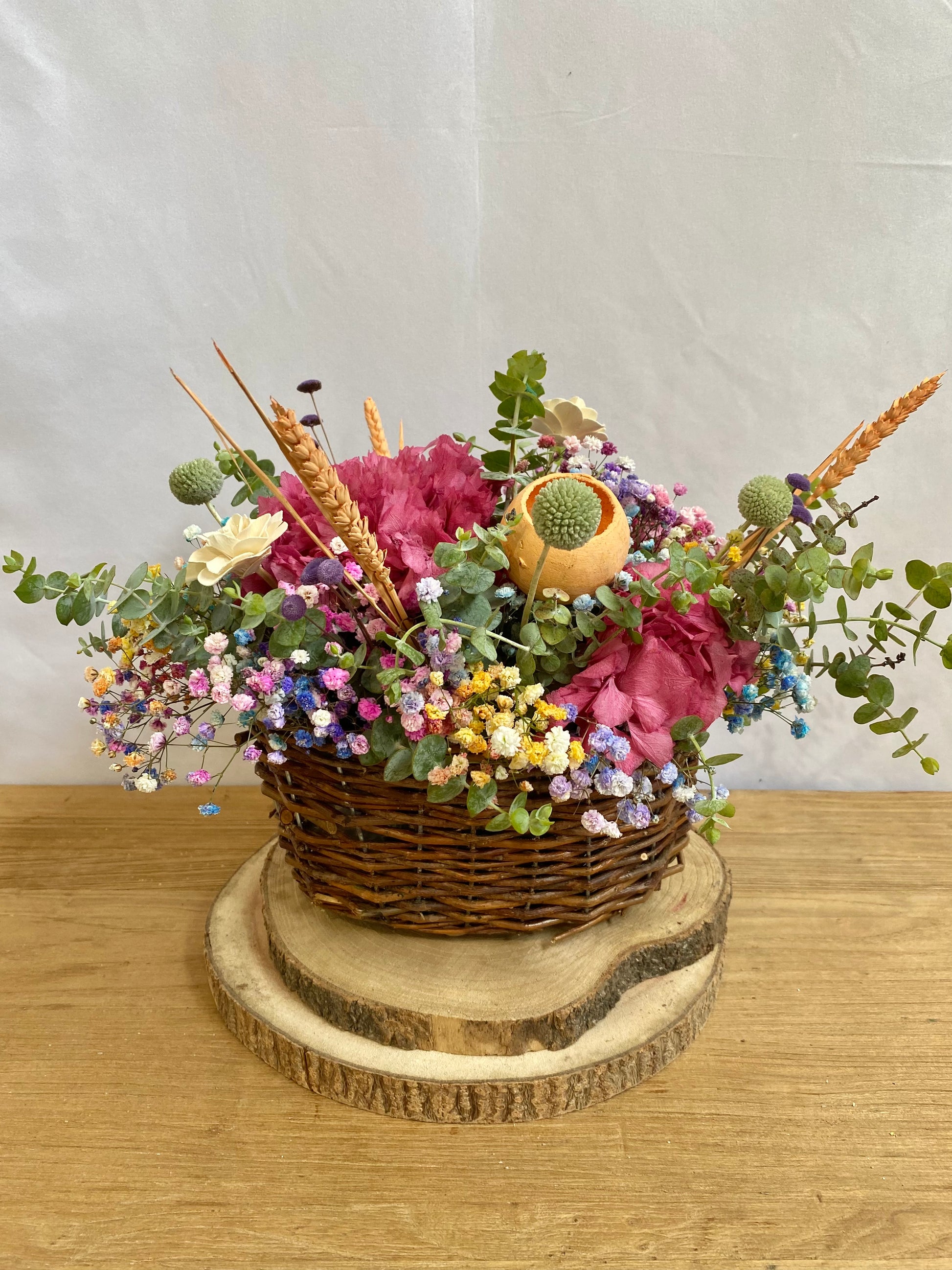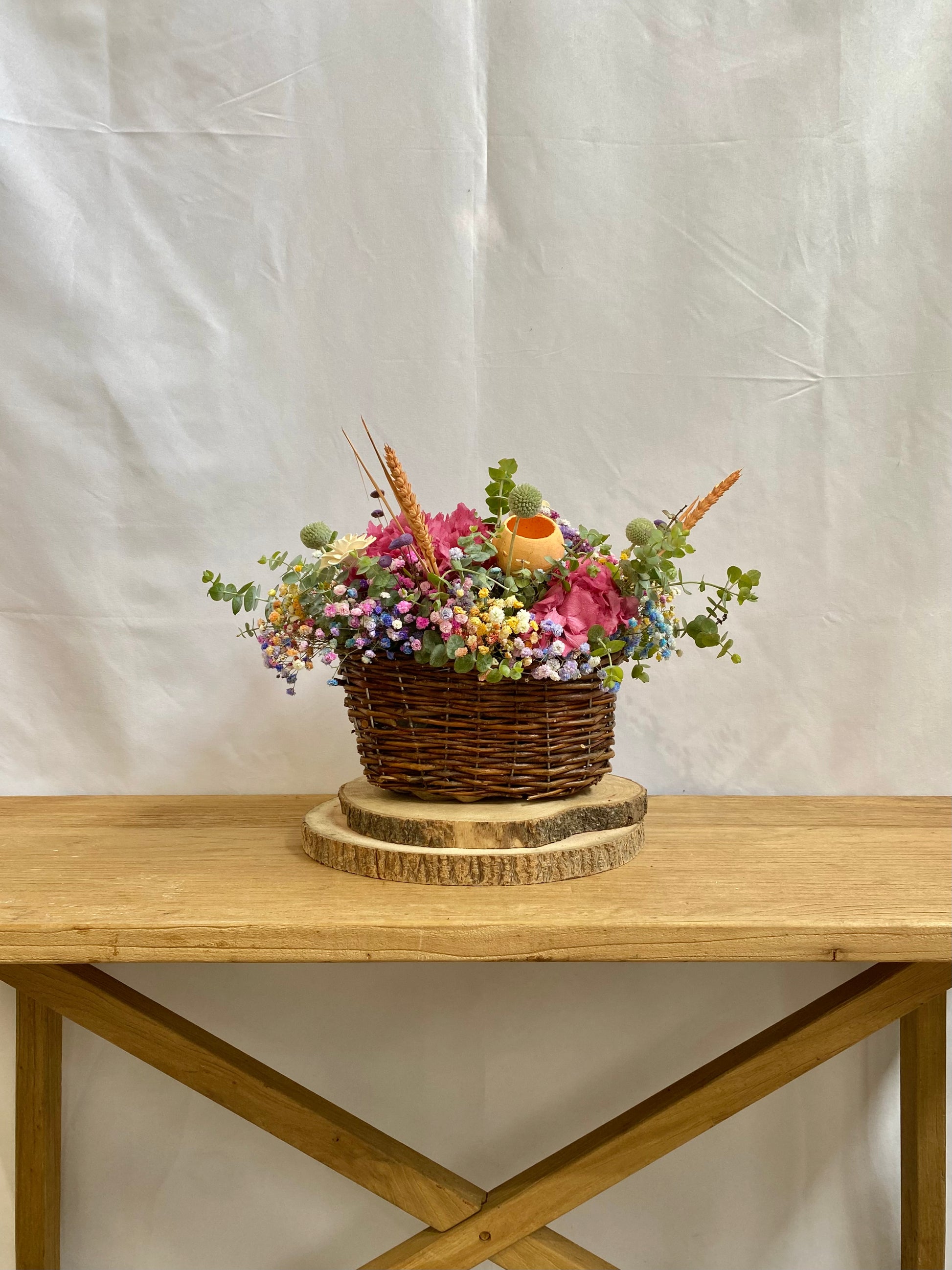 Cesta ovalada de mimbre natural en color oscuro de 25 cm compuesta por eucalipto cinérea, paniculata multicolor en tonos pastel, hortensia preservada rosa, craspedia preservada verde agua, trigo teñido melocotón, flores de madera, bell cup melocotón y amarelino morado.