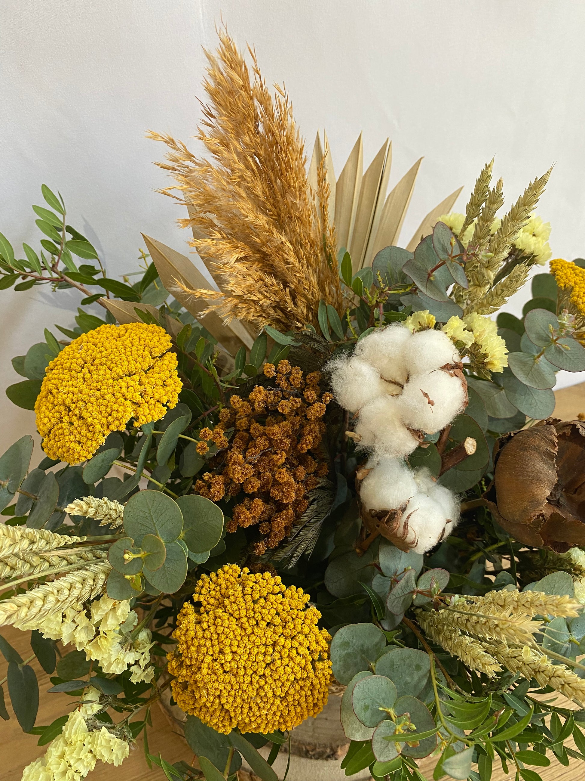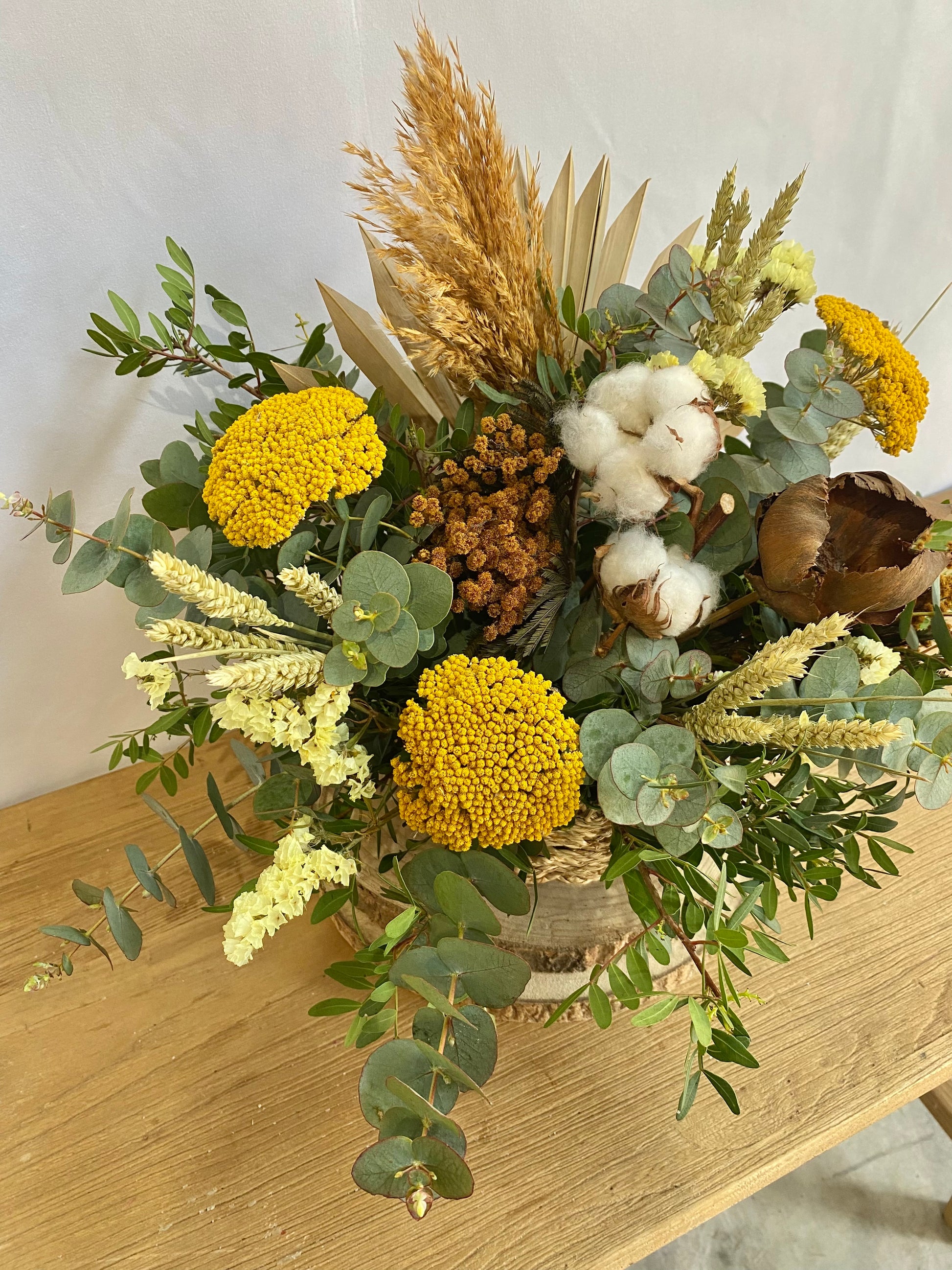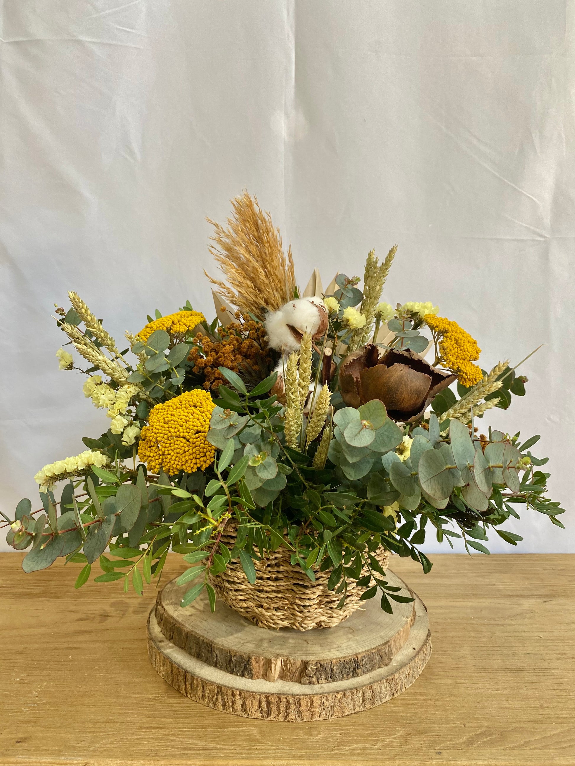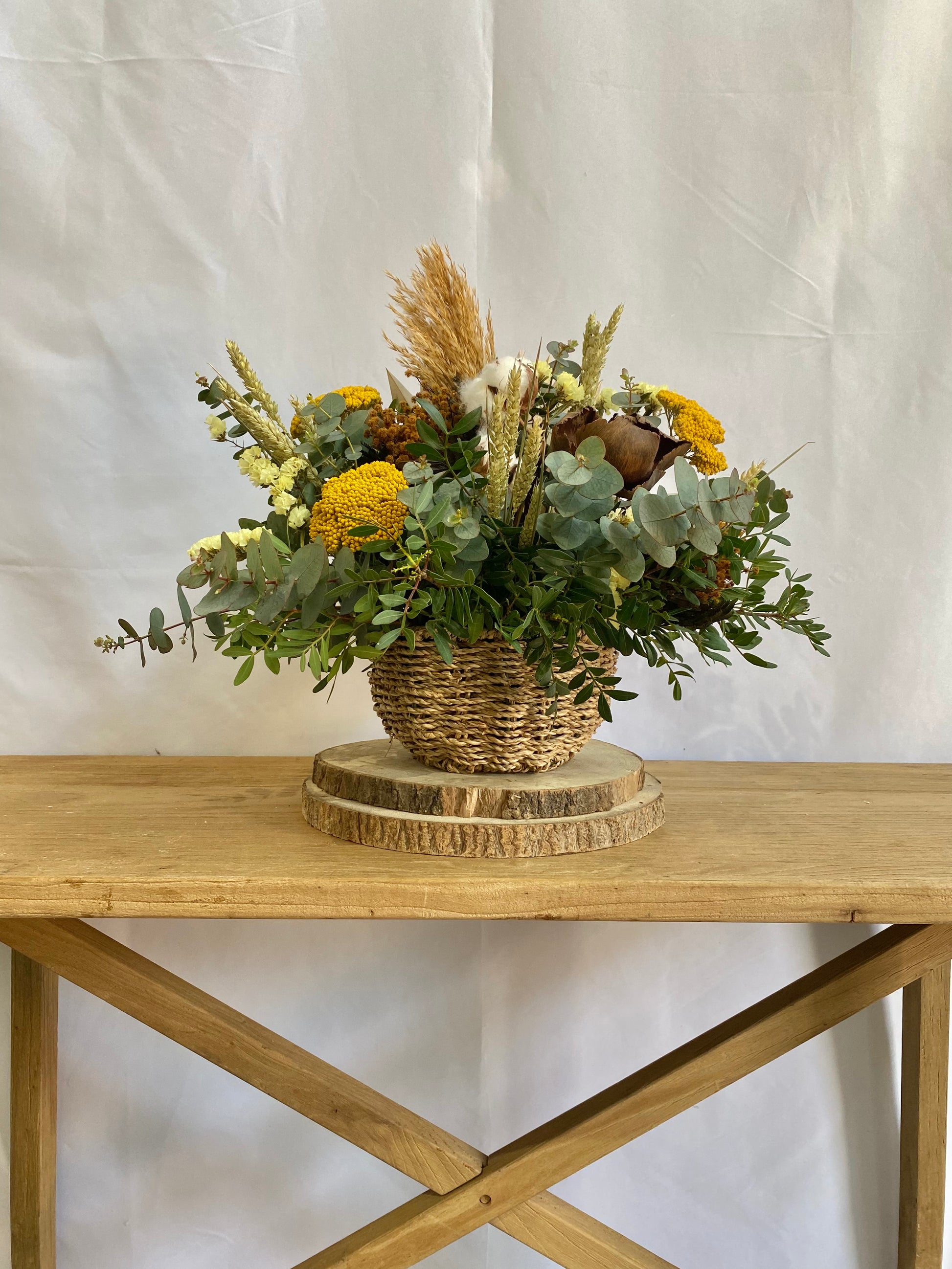 Cesta redonda de cuerda natural de 20 cm de diámetro compuesta por lentisco, eucalipto cinérea, achilea, statice amarillo, mimosa preservada, trigo natural seco, pampa, flor de algodón y flor de madera.
