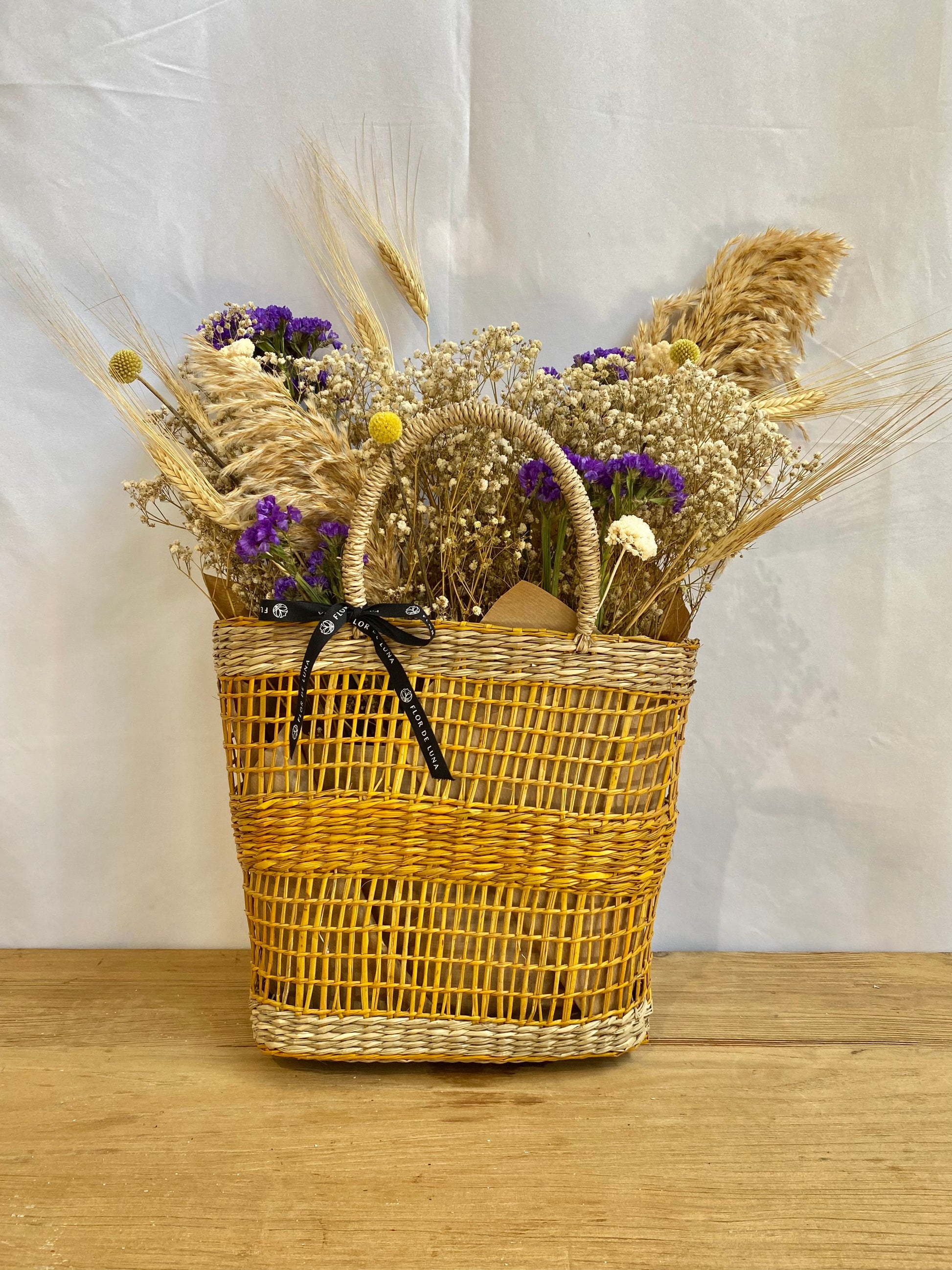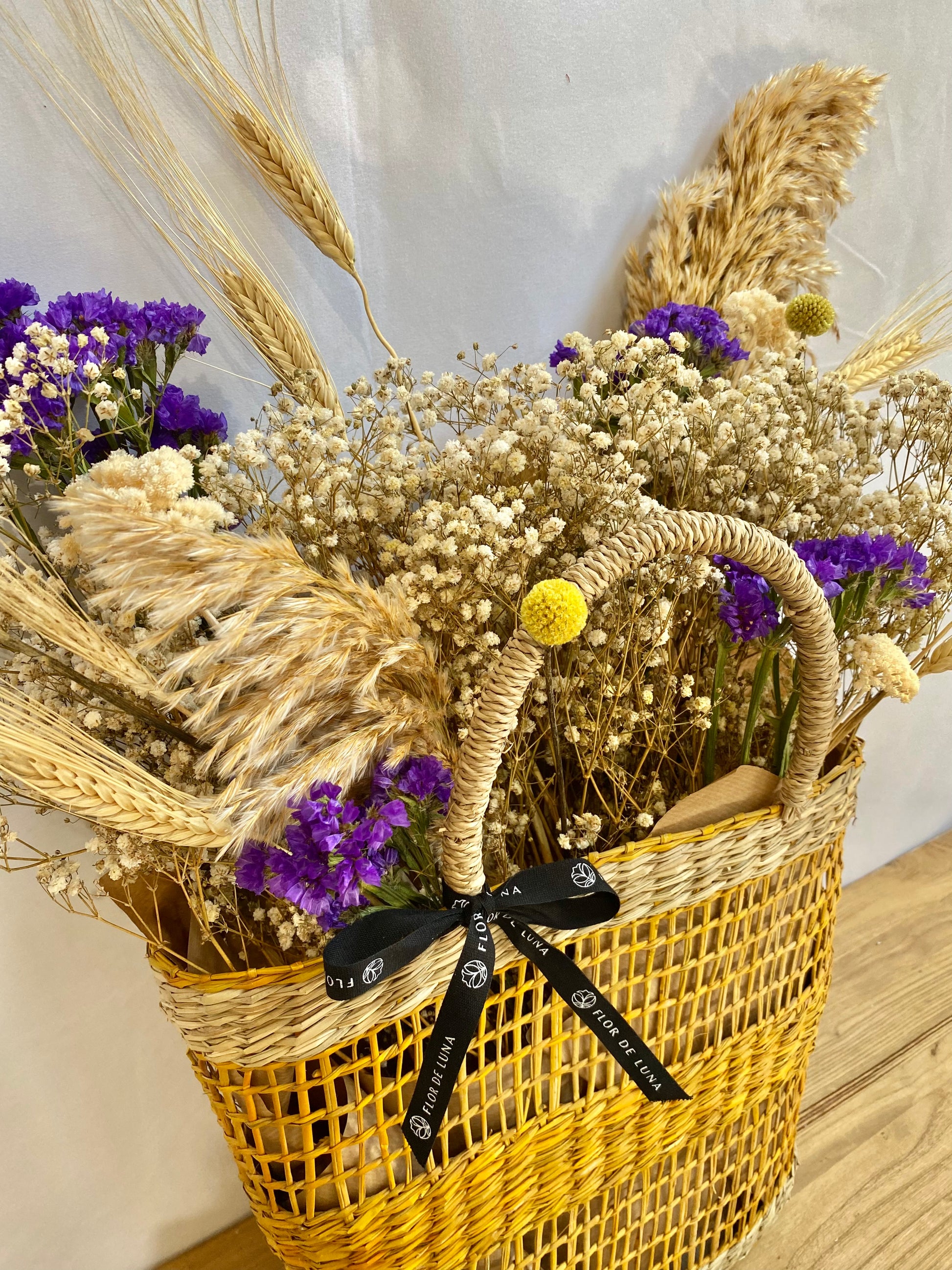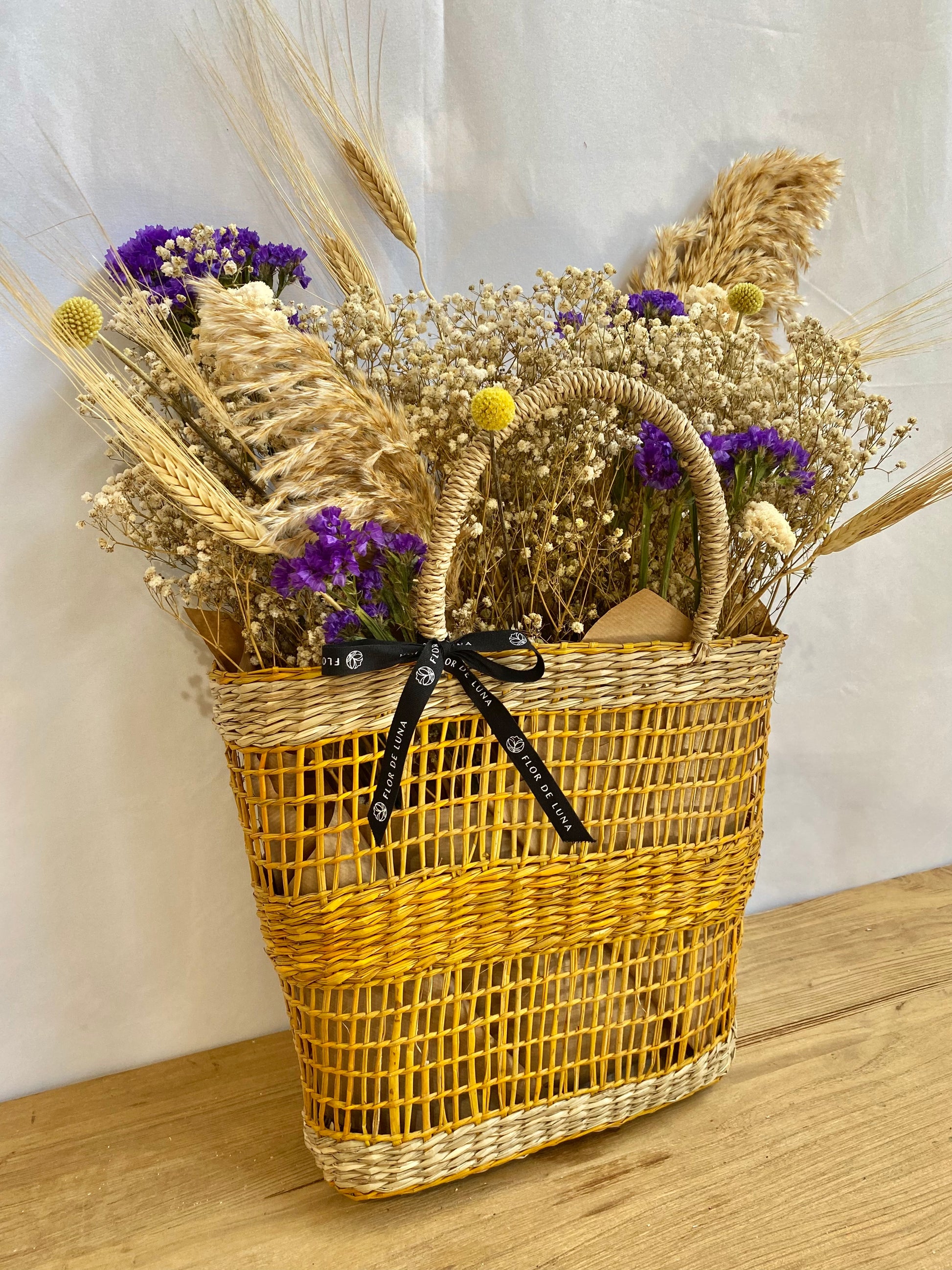 Cesta capazo de fibra natural en color natural y amarillo compuesta por paniculata blanca, statice morado, craspedia amarilla, achilea blanca, trigo y plumero natural.