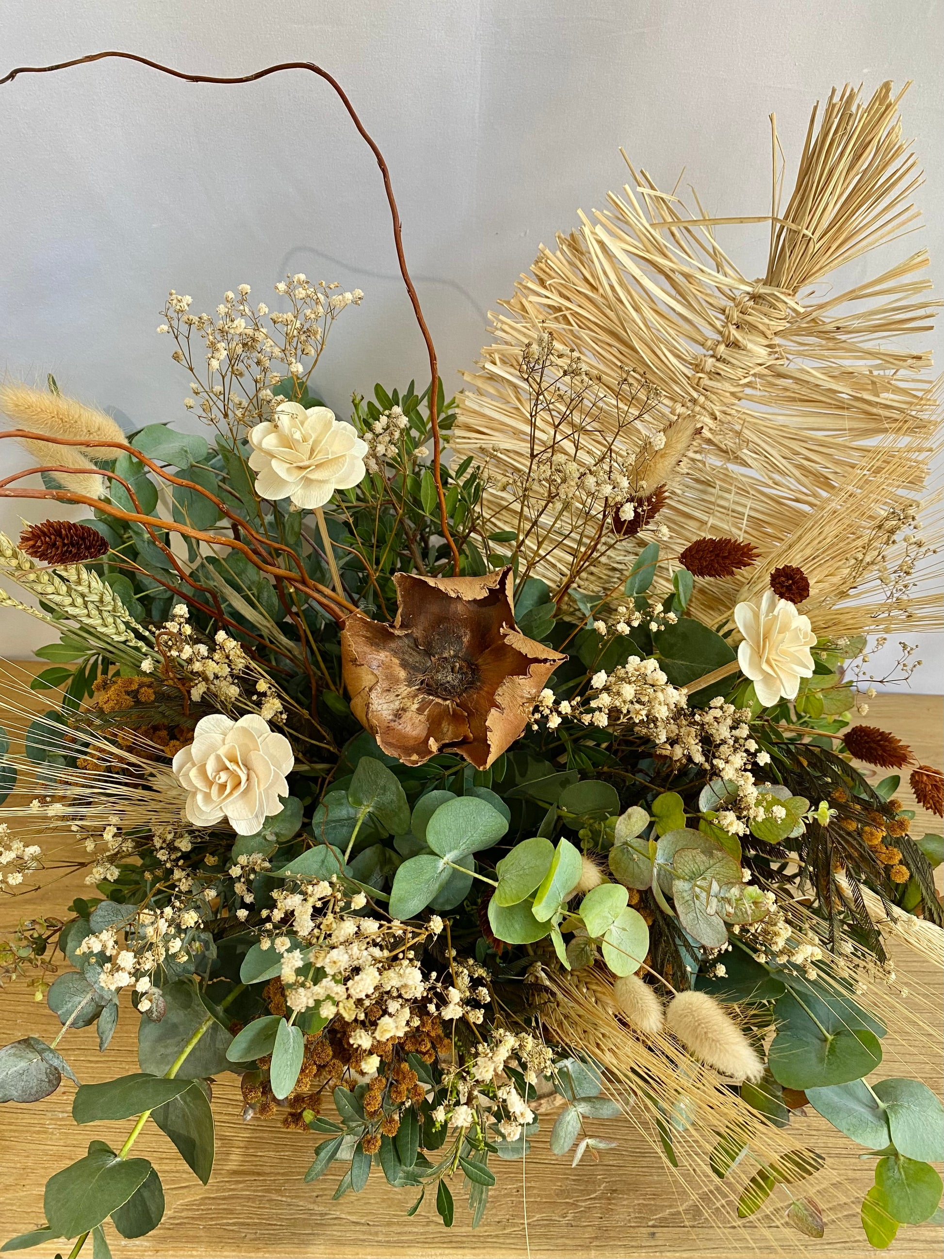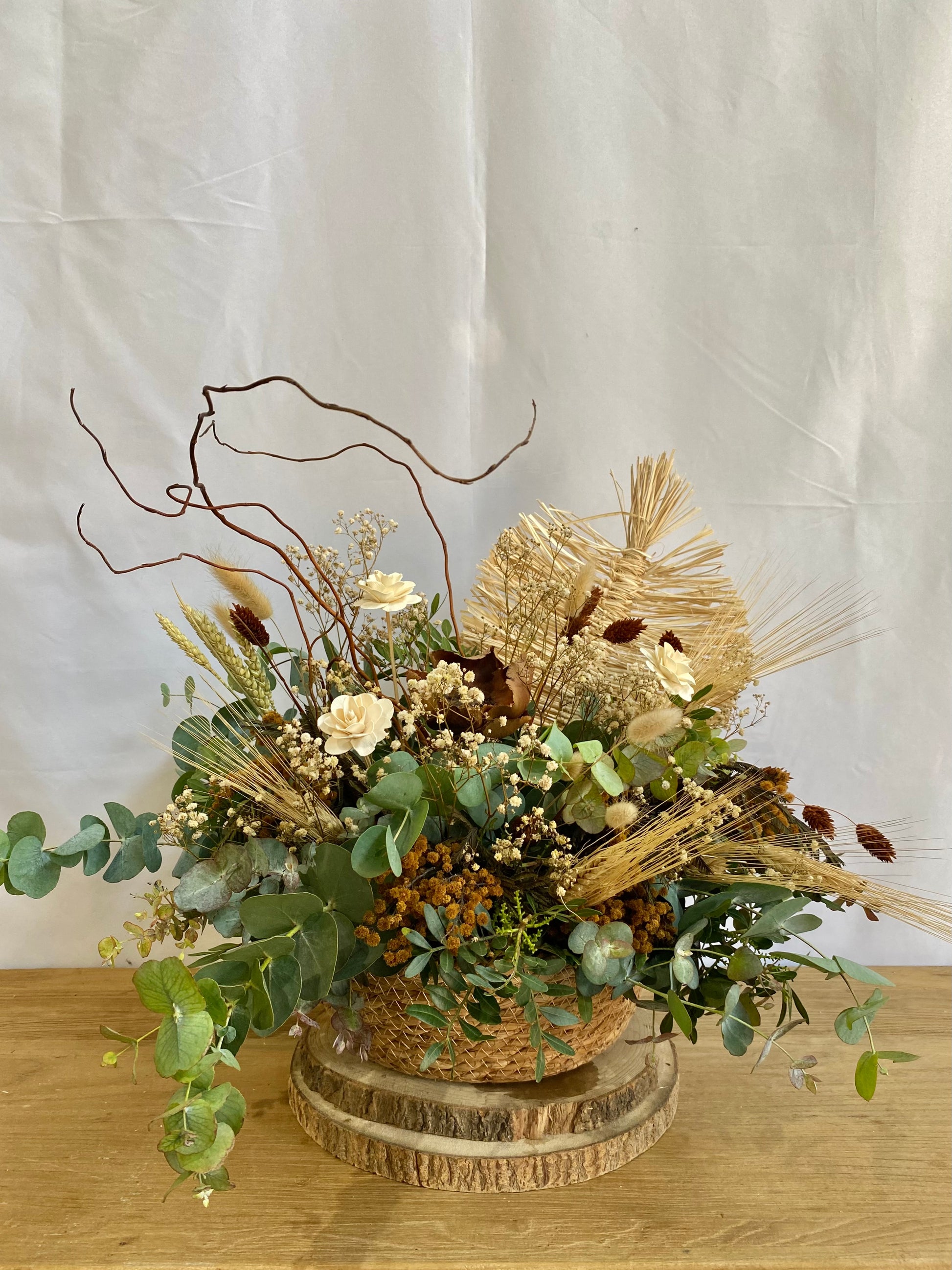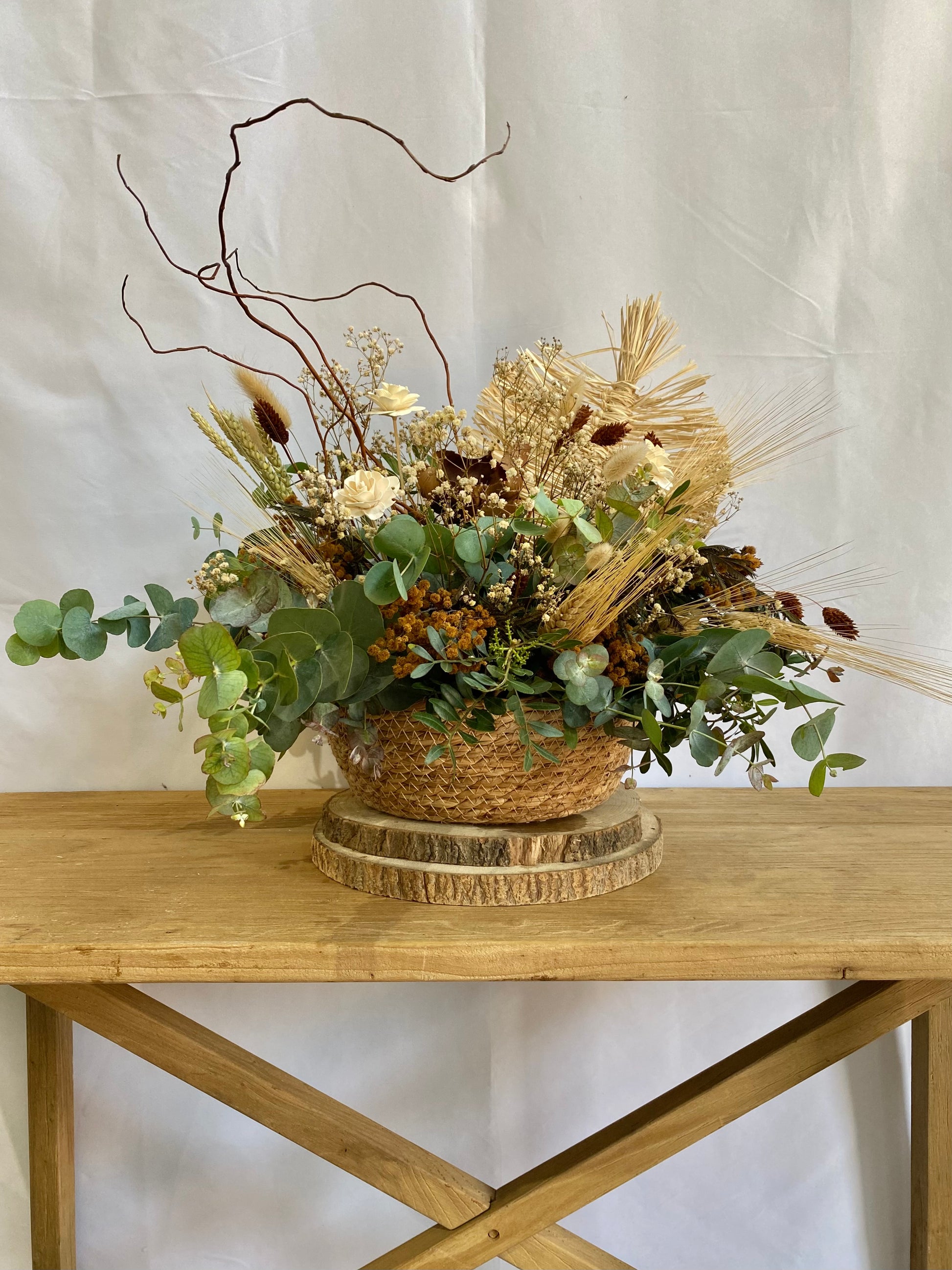 Cesta redonda de yute natural de 30 cm de diámetro compuesta por lentisco, eucalipto cinérea, mimosa preservada, hoja boho de rafia natural, paniculata seca, trigo natural seco, pharalis marrón, lagurus natural, 2 tipo de flores de madera y salix.