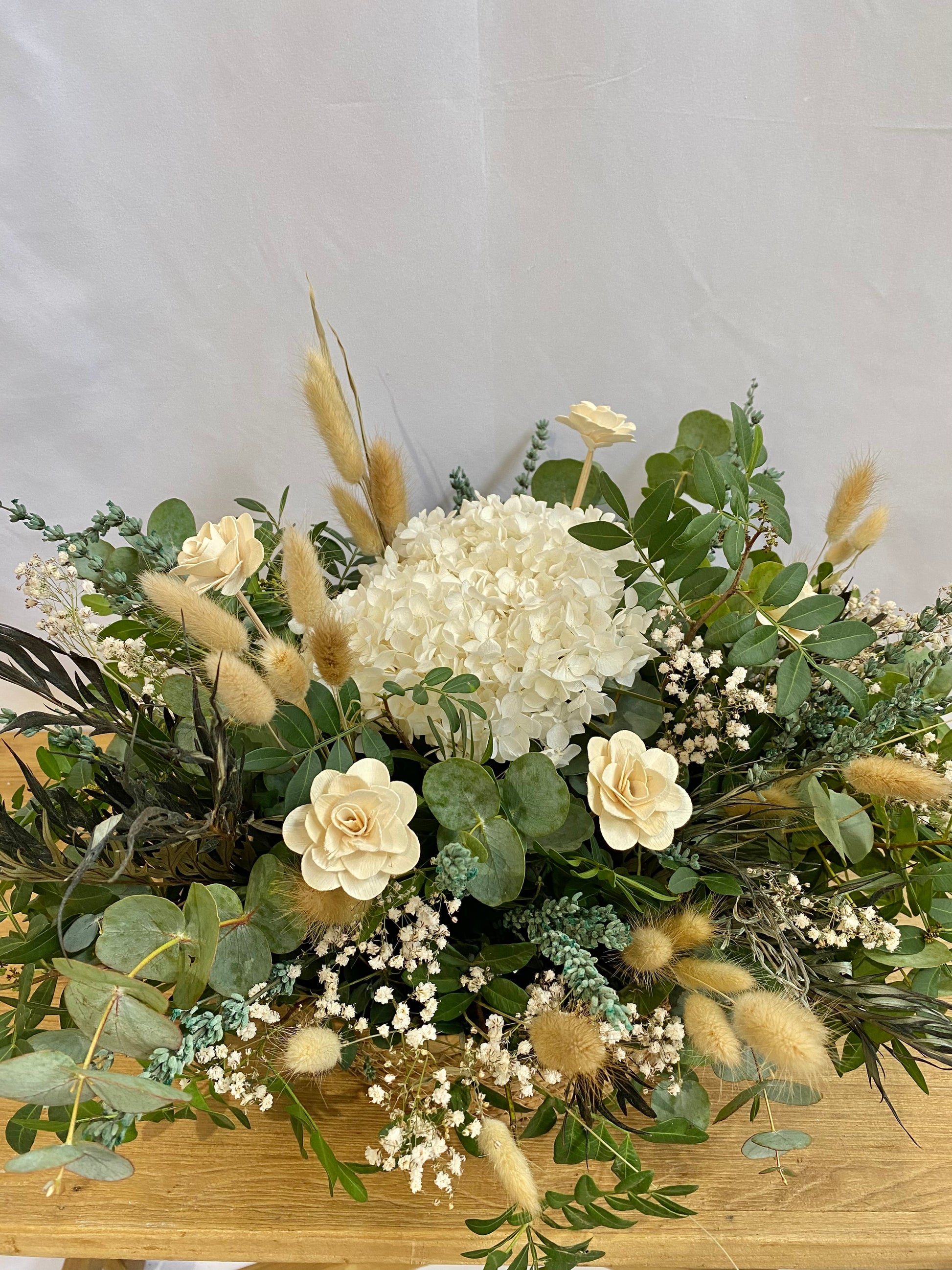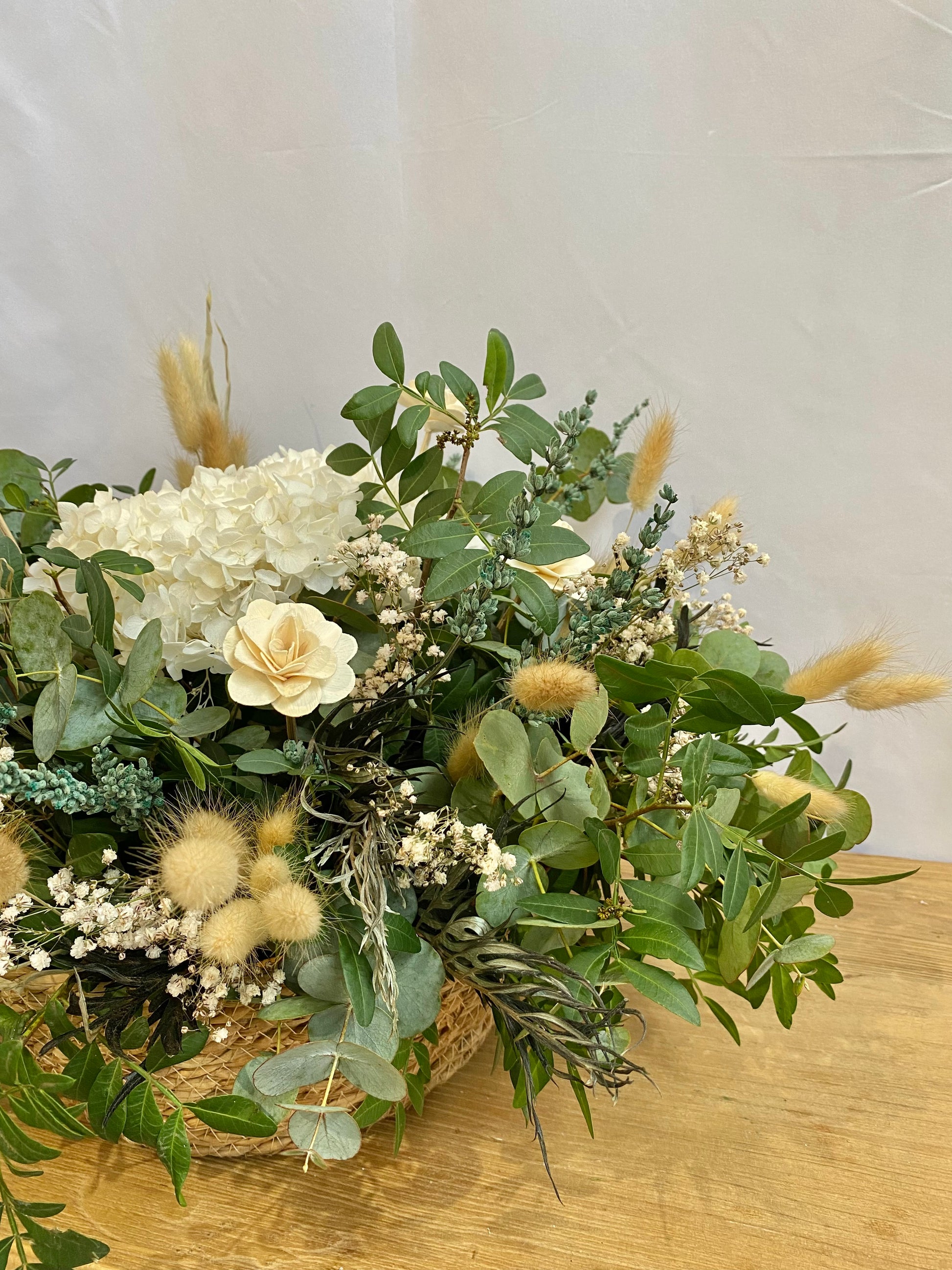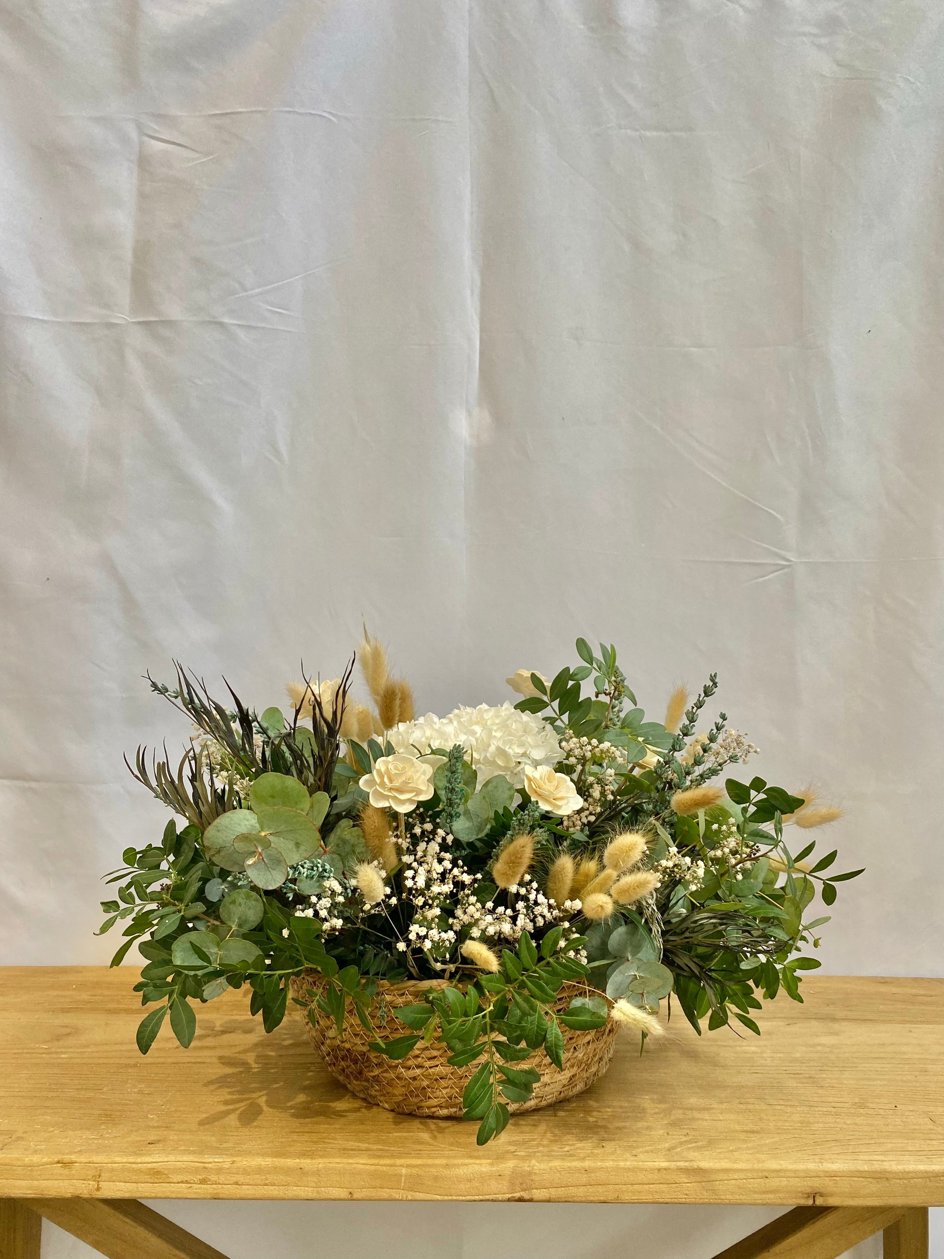 Cesta redonda de yute natural de 30 cm de diámetro compuesta por lentisco, eucalipto cinérea, grevillea, paniculata blanca, hortensia preservada blanca, rosas blancas de madera de cedro, lagurus natural y lavanda azul.