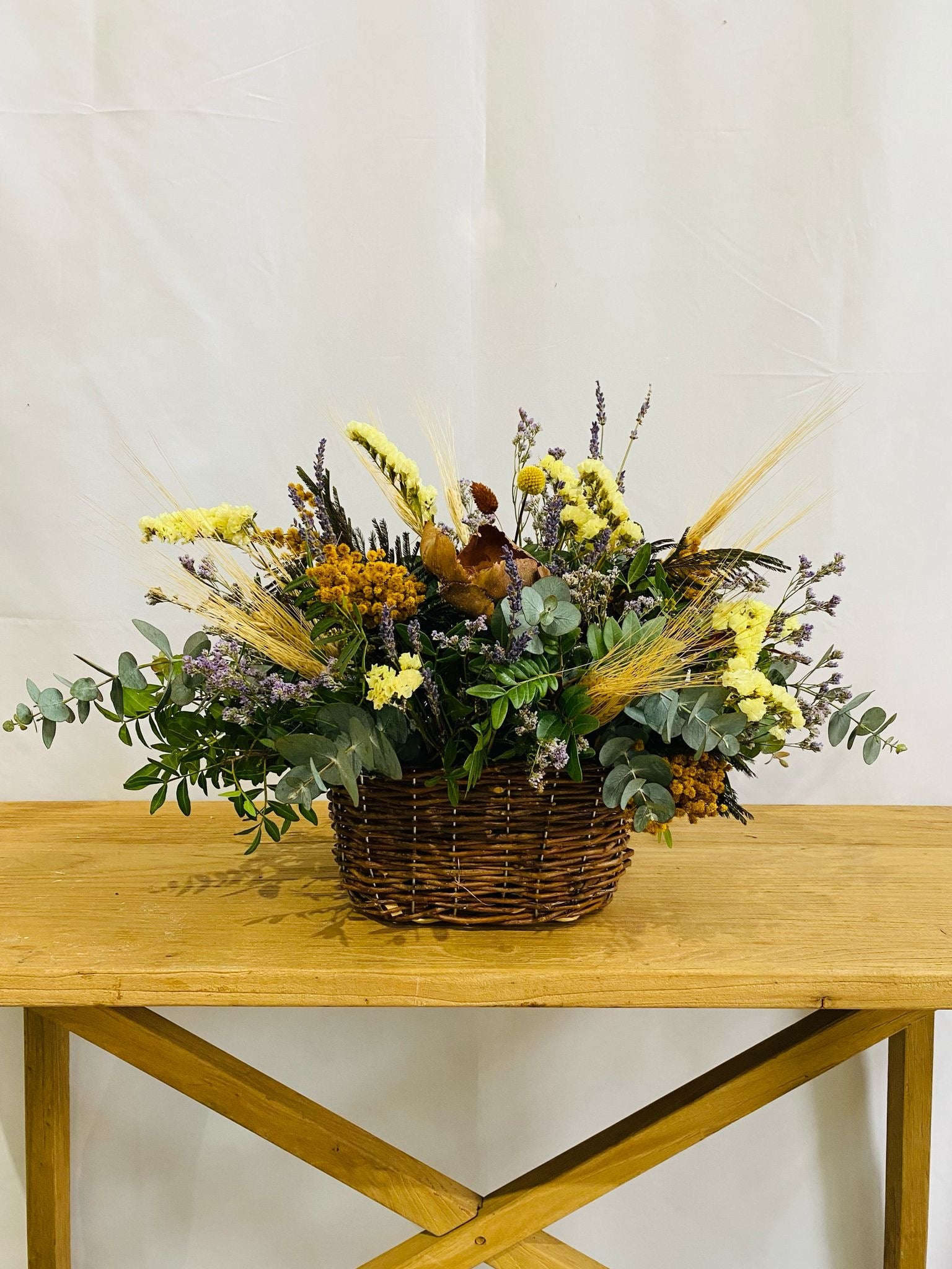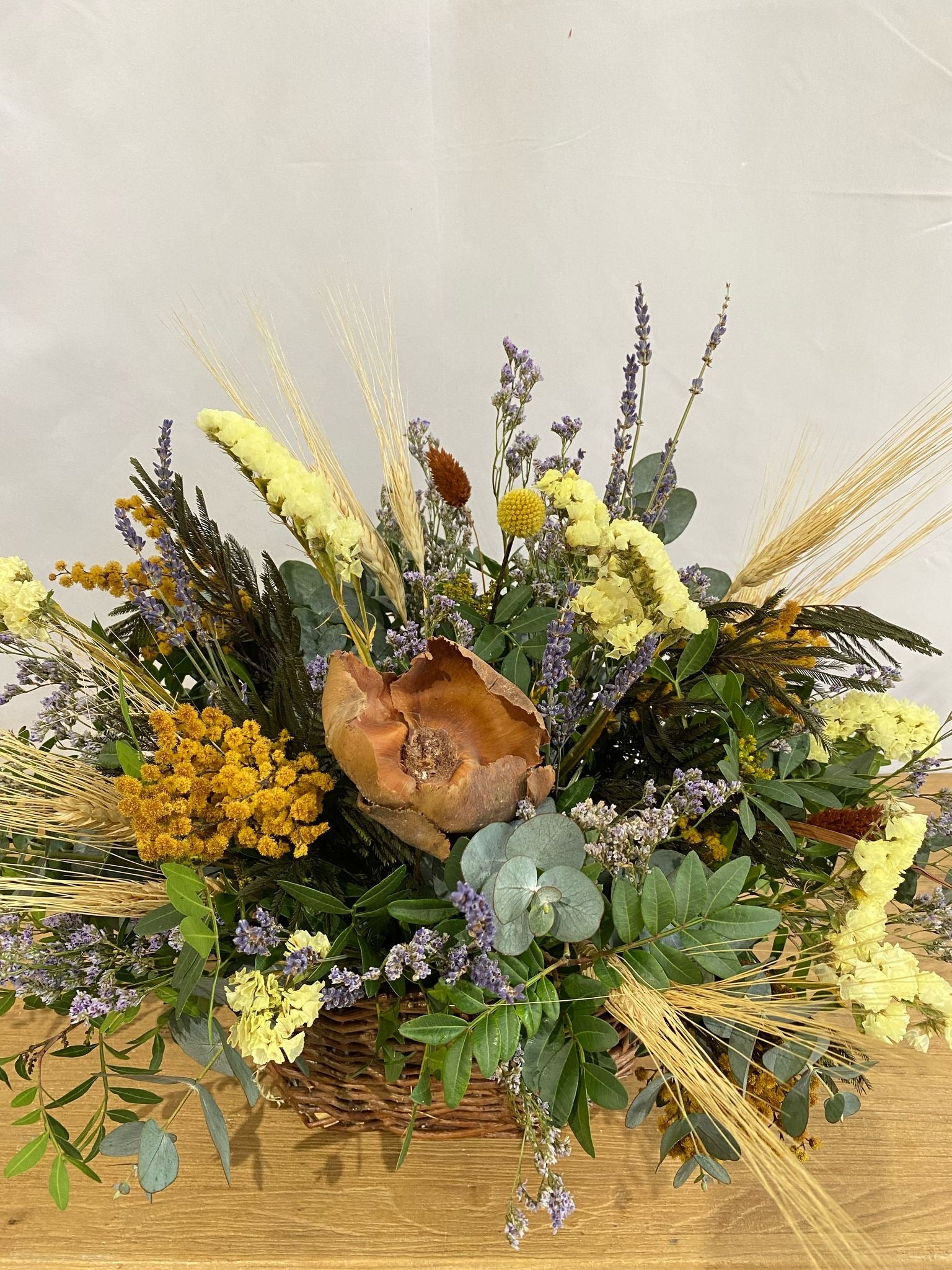 Elaborada con una base de lentisco y eucalipto natural y flores como limonium morado, statice marillo, trigo natural, pharalis marrón, craspedia amarilla, lavanda natural seca, mimosa preservada y flor de madera.
