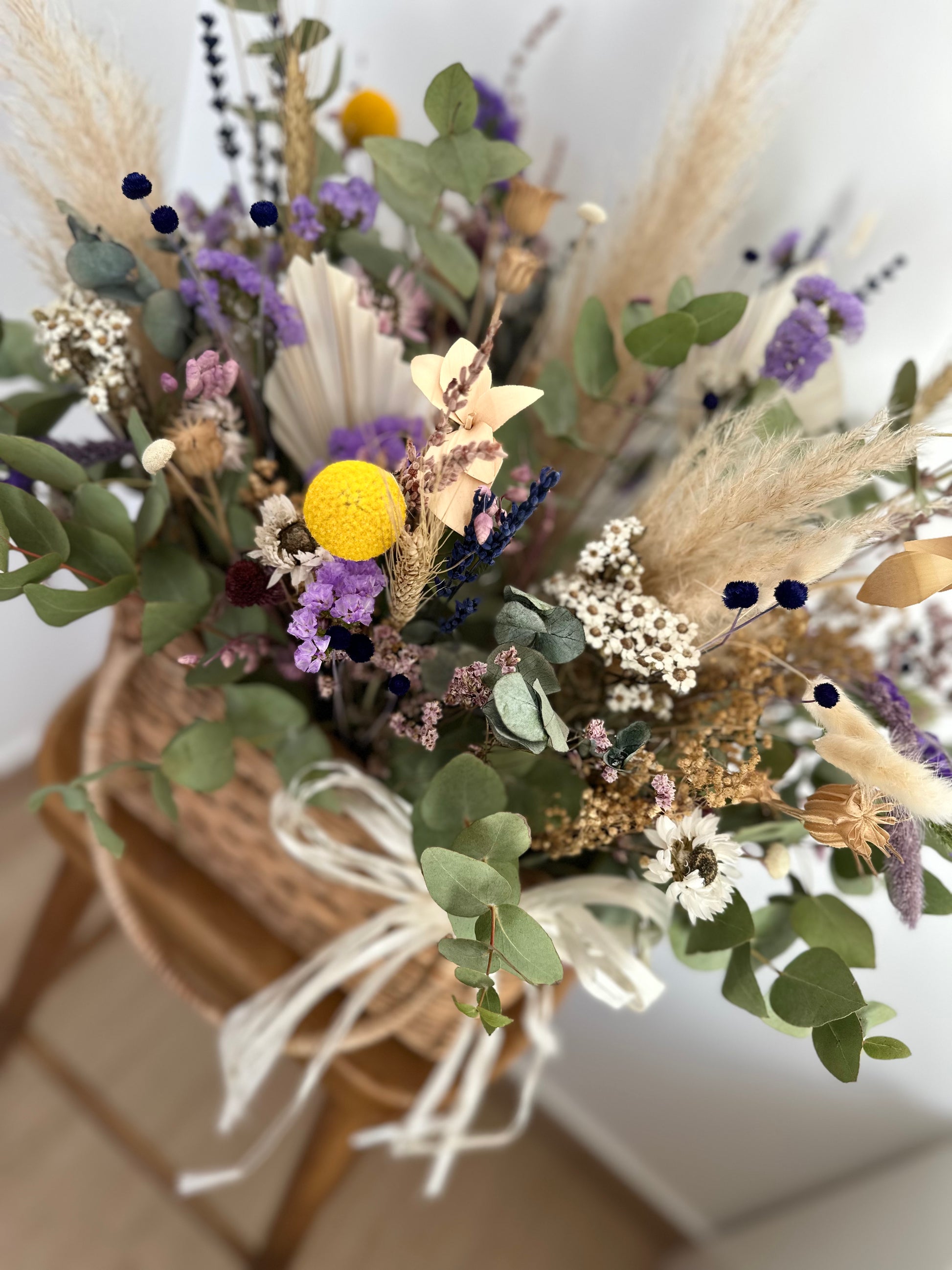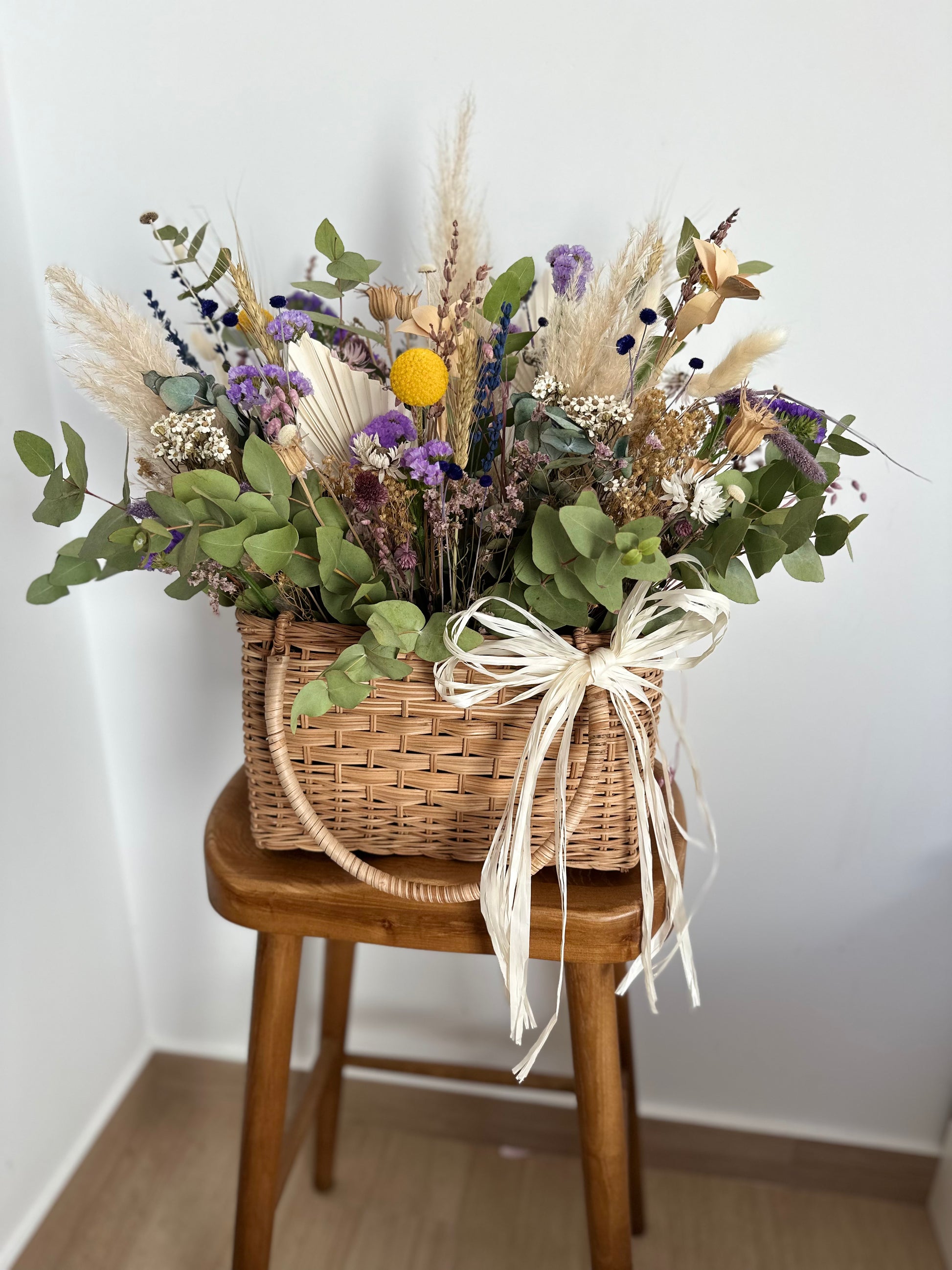 Cesta rectangular de fibra natural en color marrón de dimensiones 35 x 18 x 15 cm compuesta por eucalipto cinérea, mix de flores secas, statice, craspedia, lavanda, lagurus, trigo, hoja de palma y pampa.