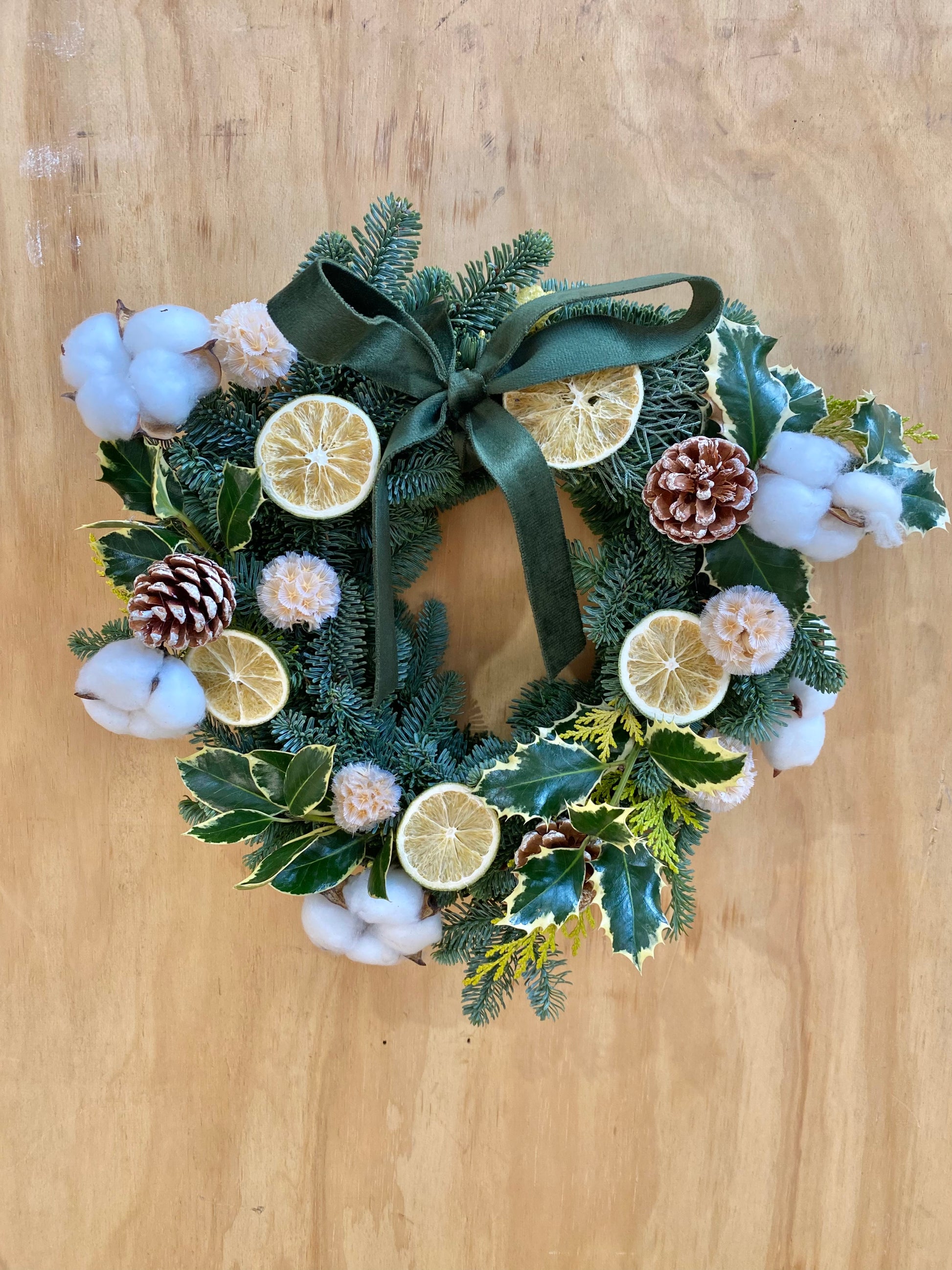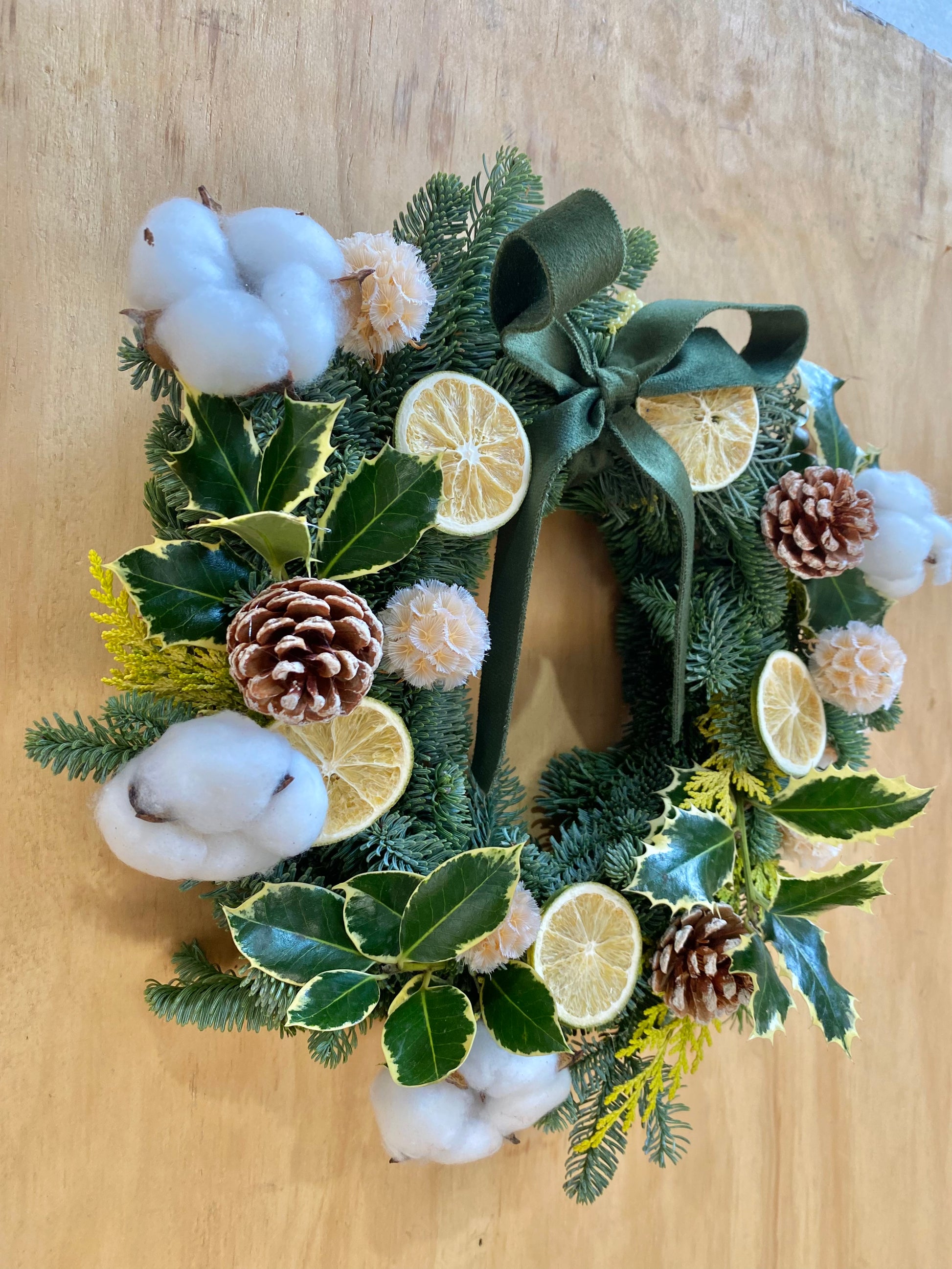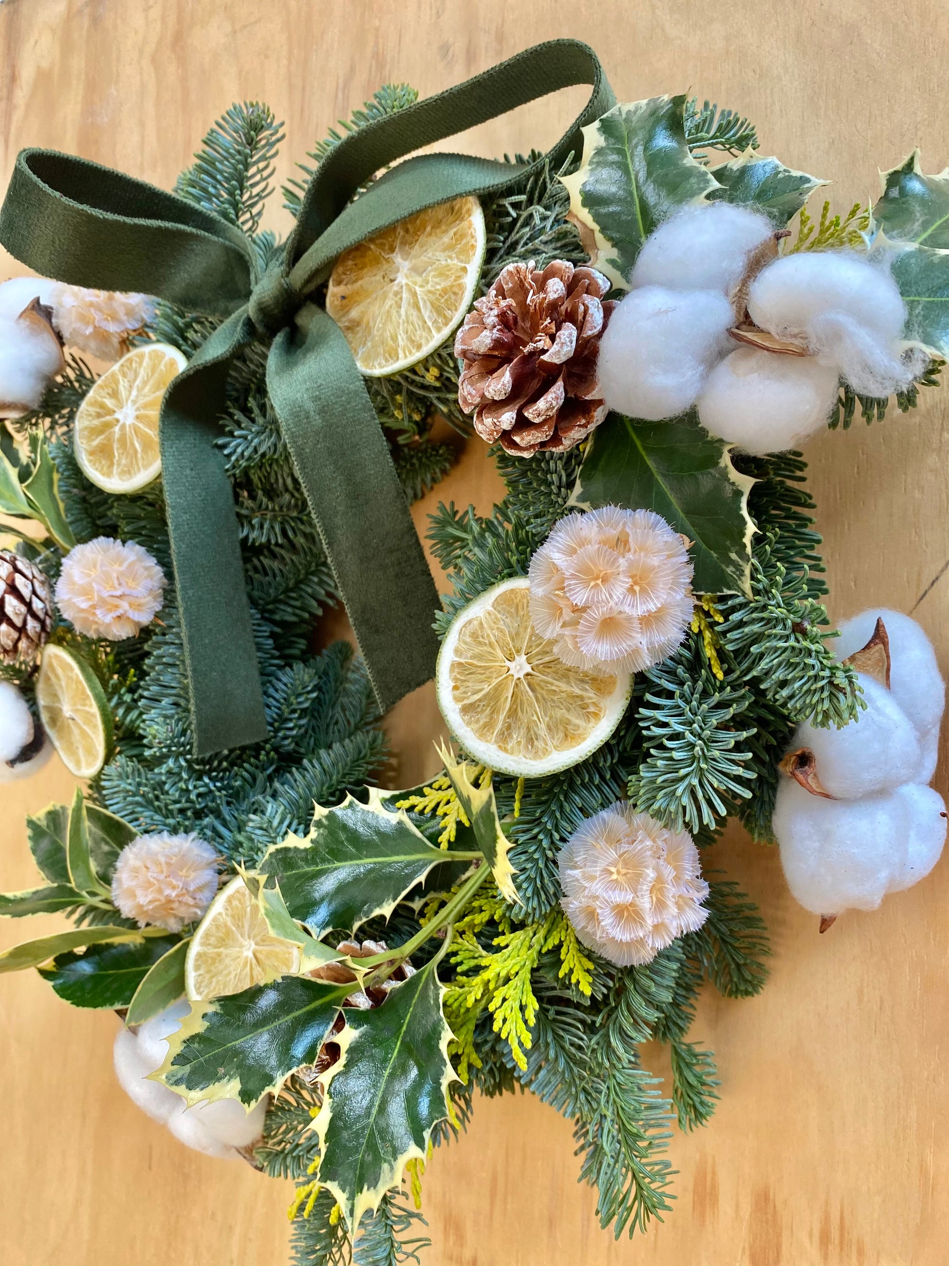 Corona Navideña de estilo actual con toques ácidos con base de aro de paja de 20cm de diámetro. Incluye lazo decorativo de terciopelo en color verde bosque. Combina elementos naturales, preservados, tintados y secos para garantizar la durabilidad y lo disfrutes durante toda la Navidad.