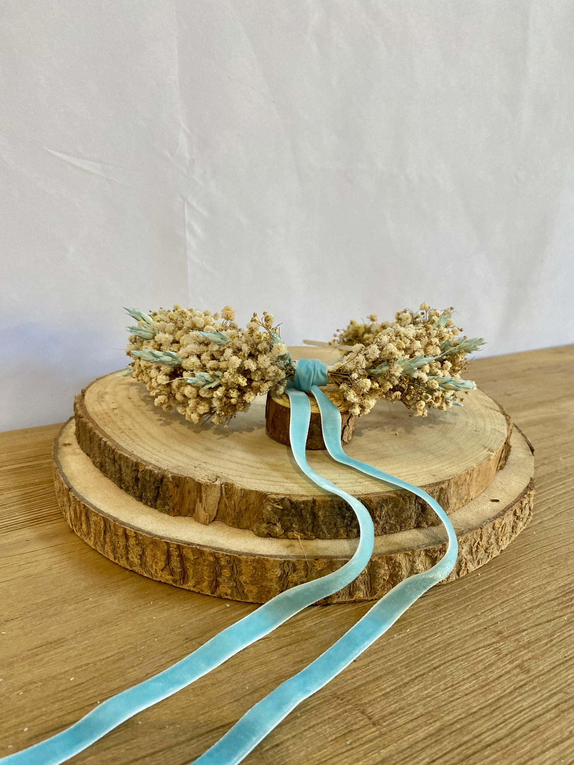 Diadema realizada con paniculata seca y trigo teñido en celeste con lazo con caída.