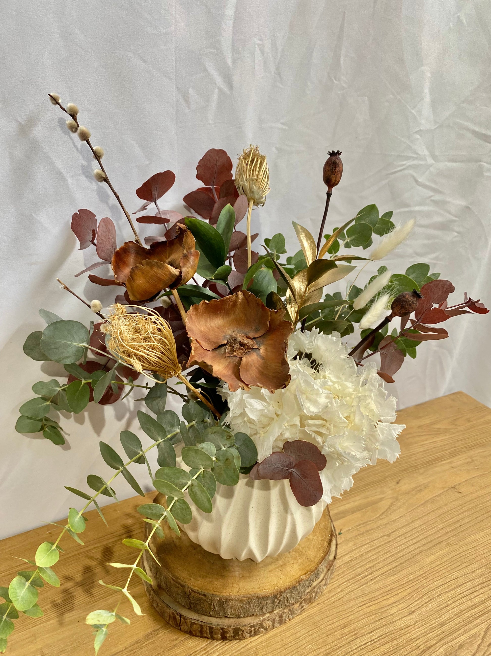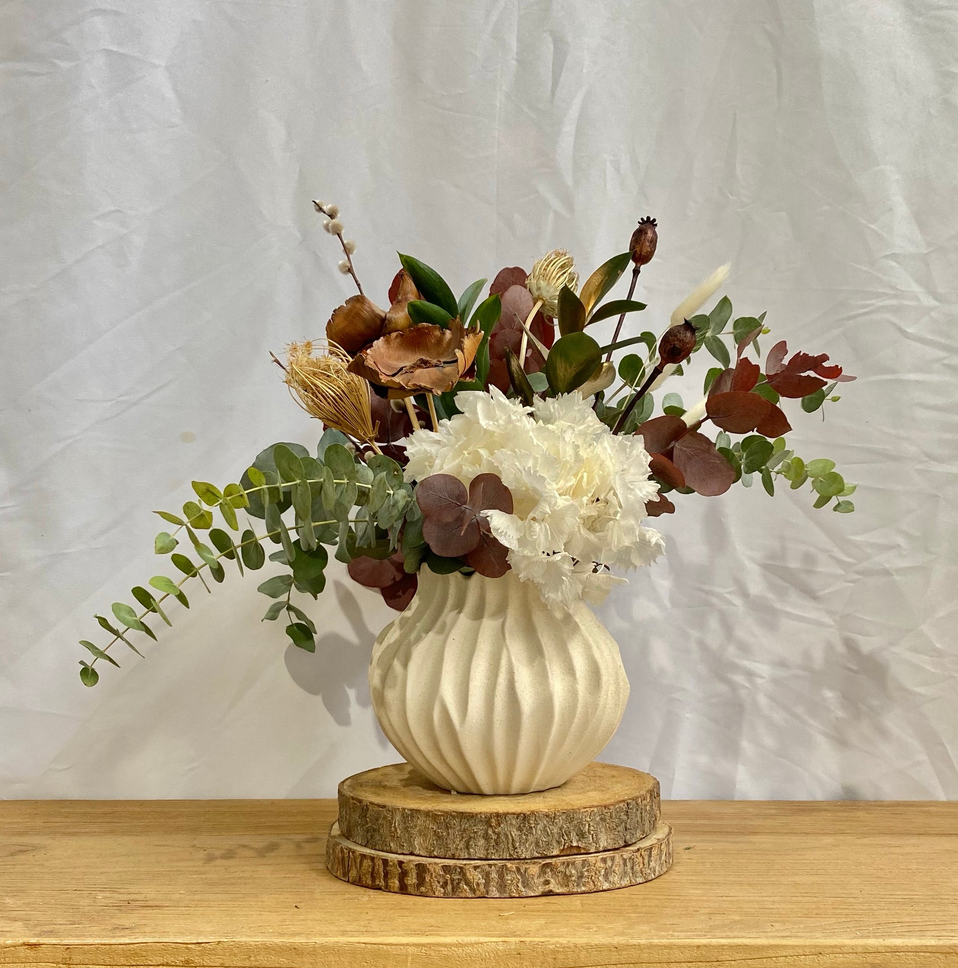 Jarrón cerámico en color blanco roto estriado con acabado rugoso. Con un diseño más vanguardista, esta composición aporta elegancia y atemporalidad a cualquier estancia donde se ubique