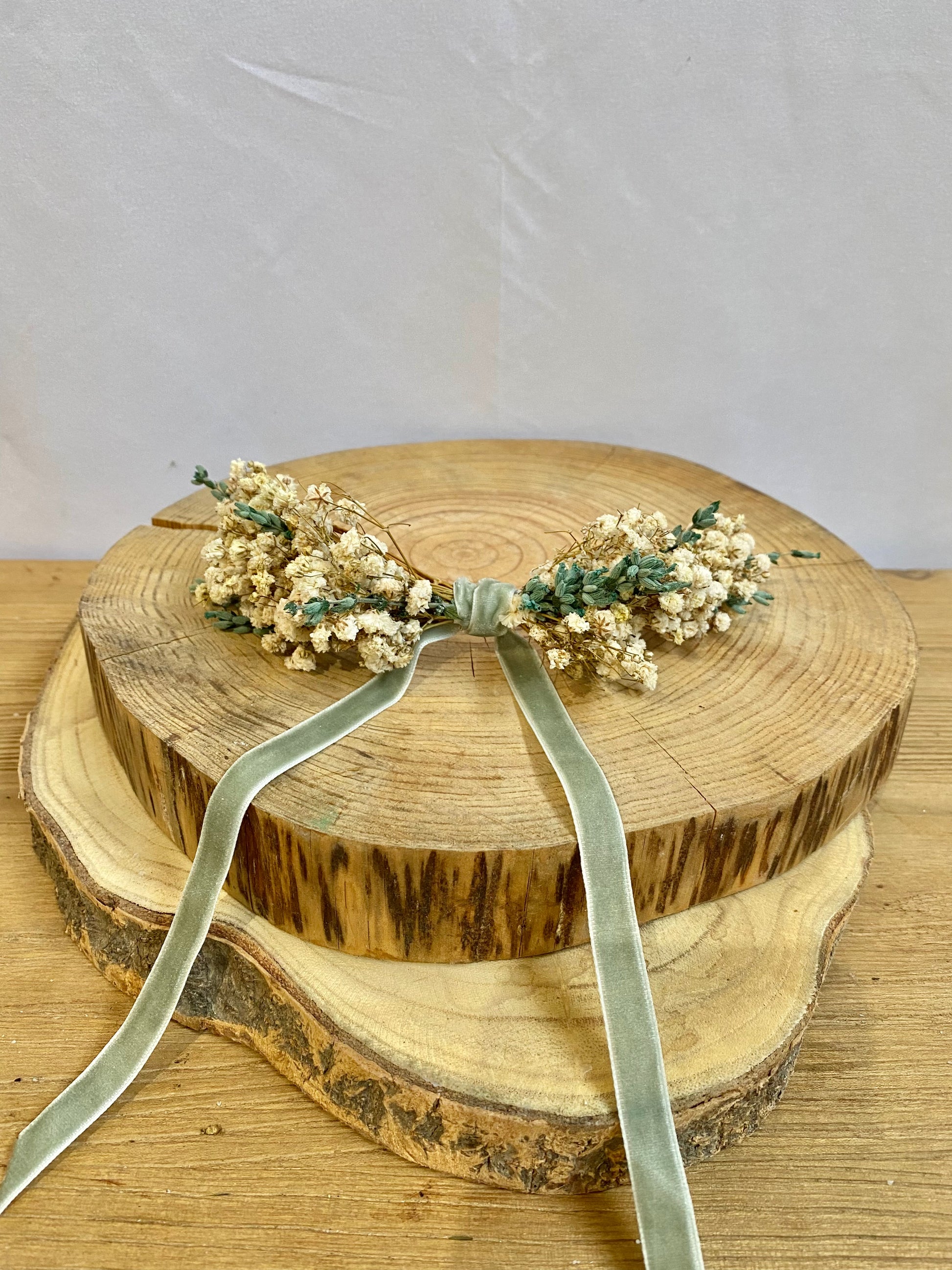 Prendido en forma de media luna realizado con Paniculata seca y Lavanda preservada con lazo de terciopelo a tono.