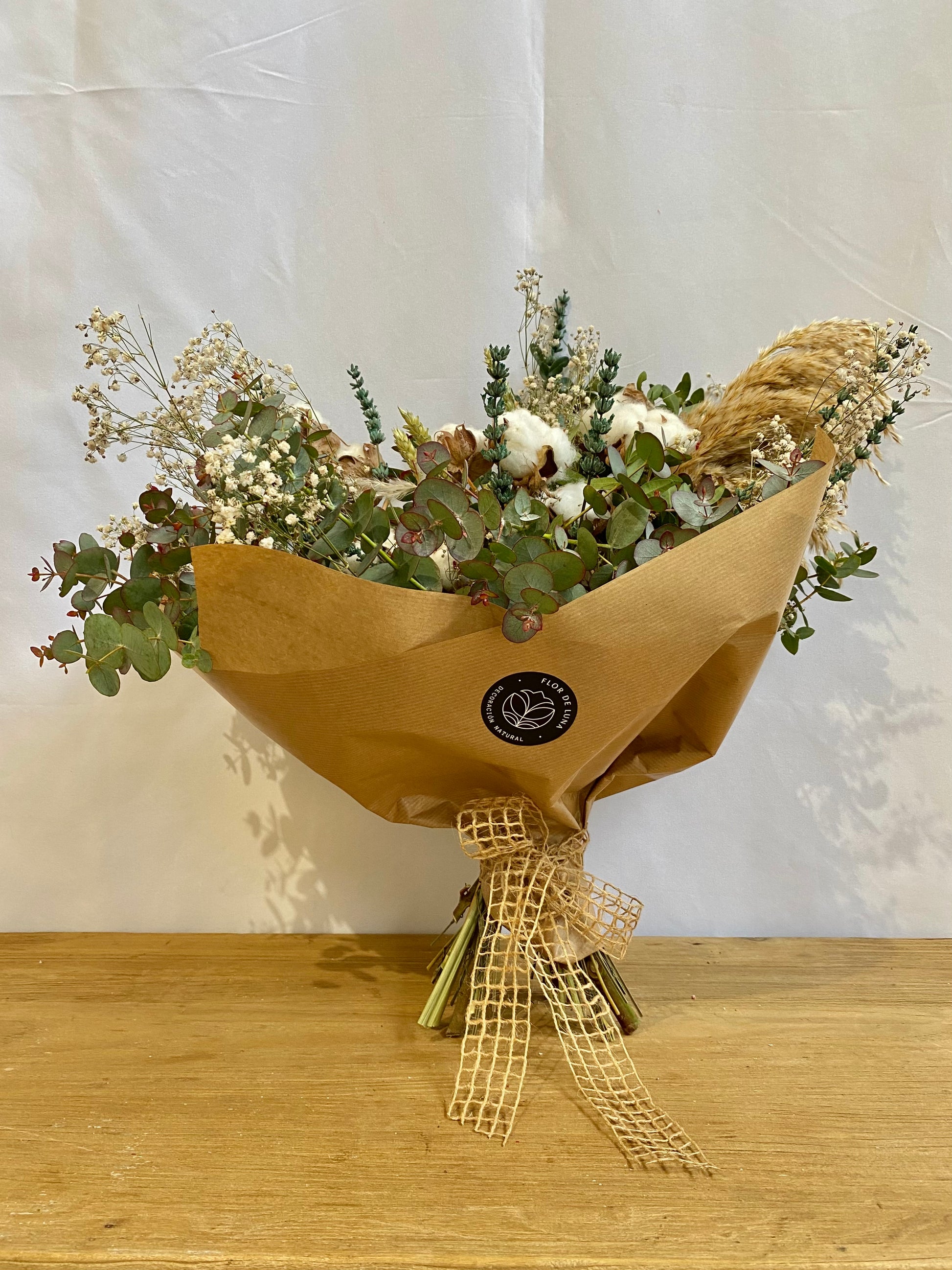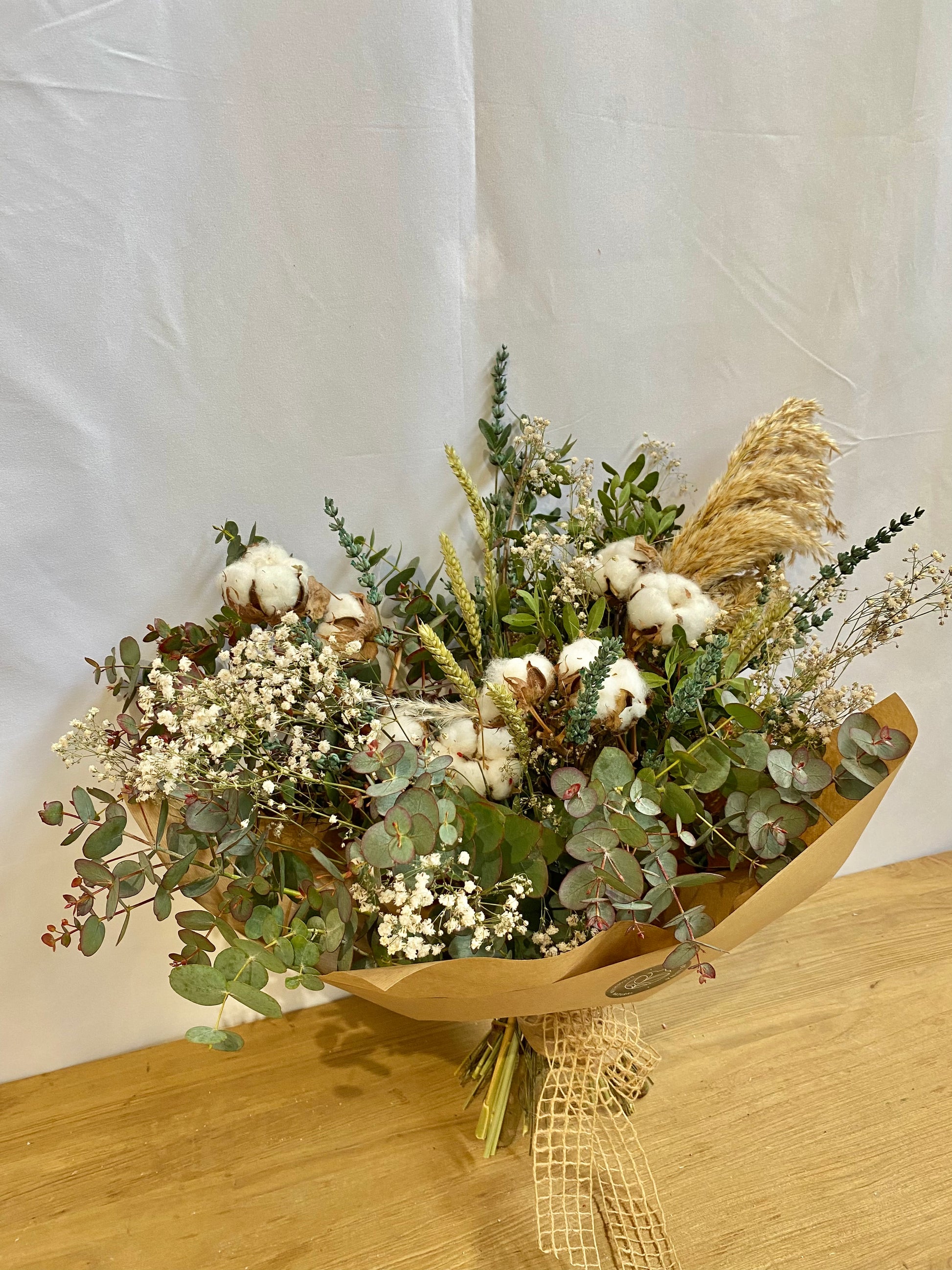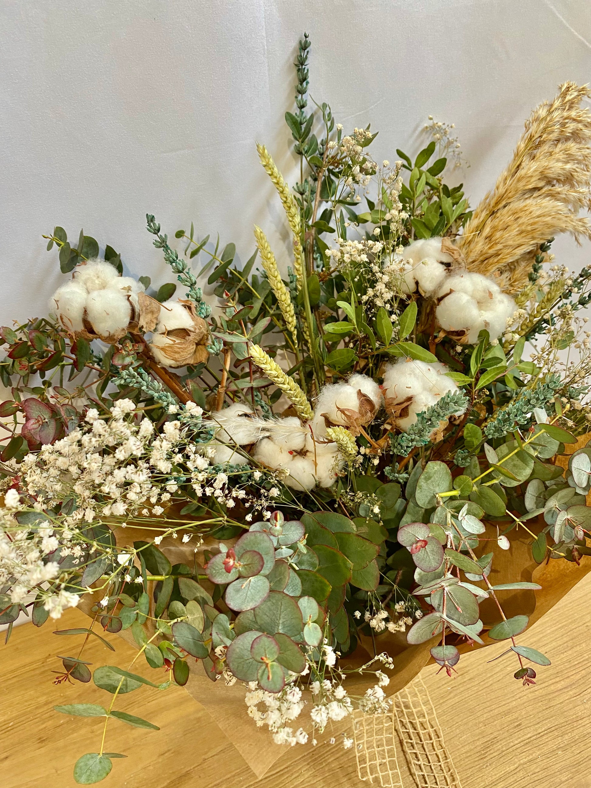 Ramo de flores secas compuesto por lentisco, eucalipto cinérea, paniculata blanca, flor del algodón, trigo, plumero y lavanda azul.