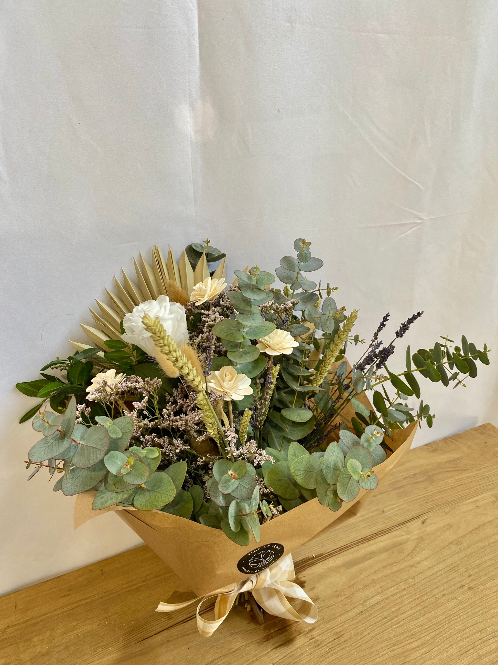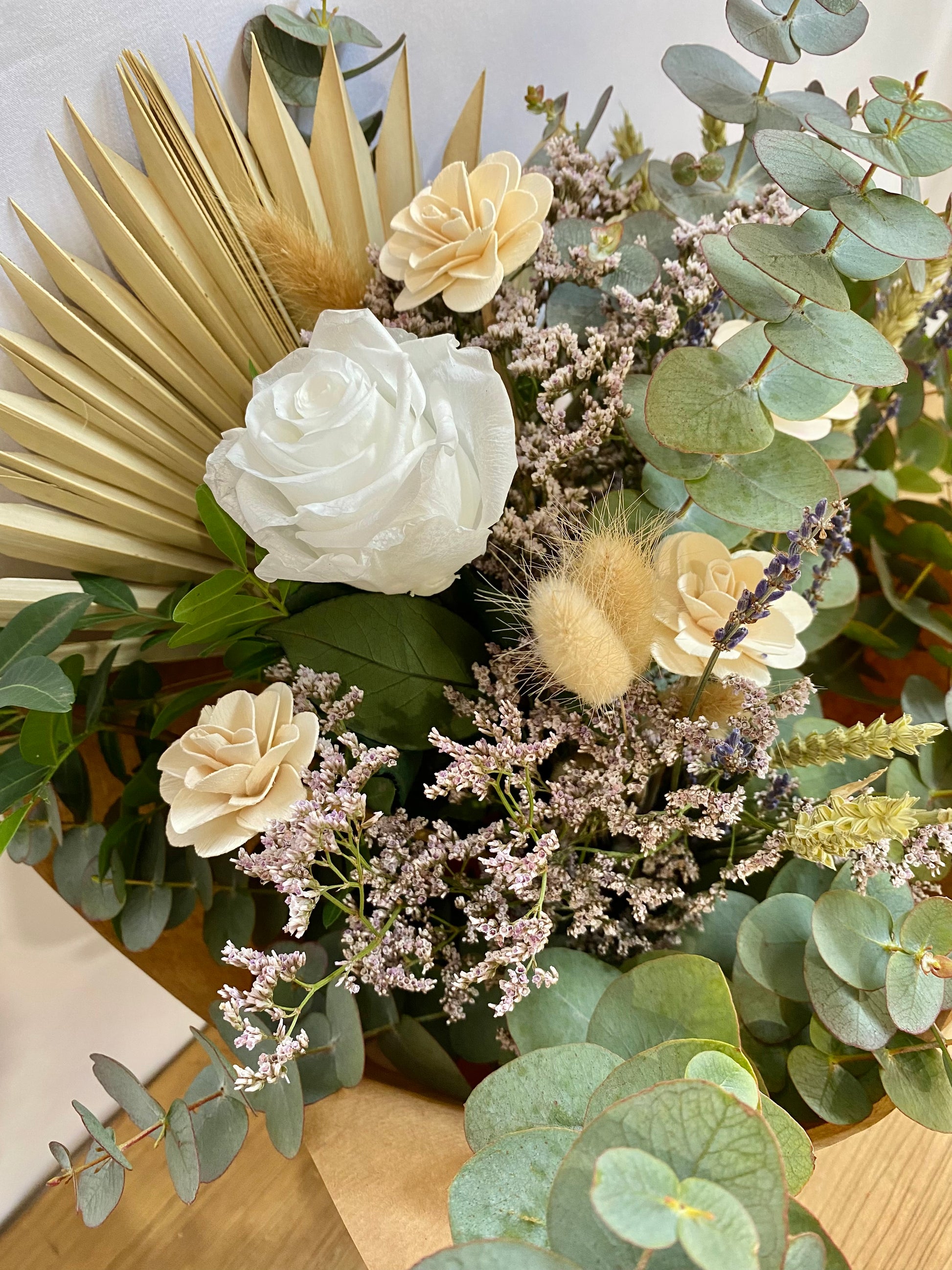 Ramo de flores secas y preservadas compuesto por lentisco, eucalipto cinérea, rosa preservada blanca, limonium malva, flores de madera de cedro, lagurus natural, trigo, hoja de palma y lavanda natural.